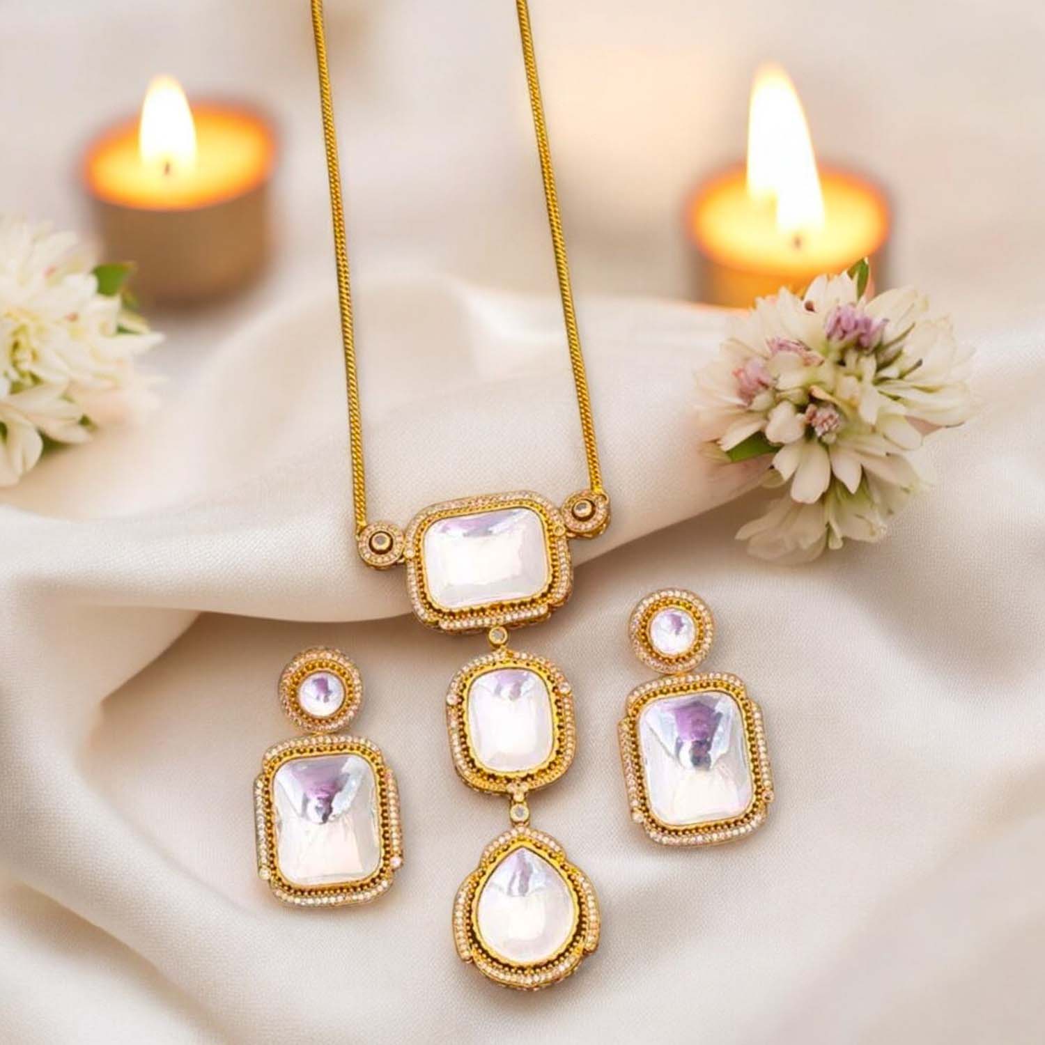 This necklace is the ultimate accessory option for the festive season. This set has a gorgeous circular floral pattern. The necklace has vibrant pearl detailing all over. The set also has a bright element of Kundan detailing in its structure. So, don't miss out on this gorgeous necklace set this eventful season as you have ramps to walk ahead.