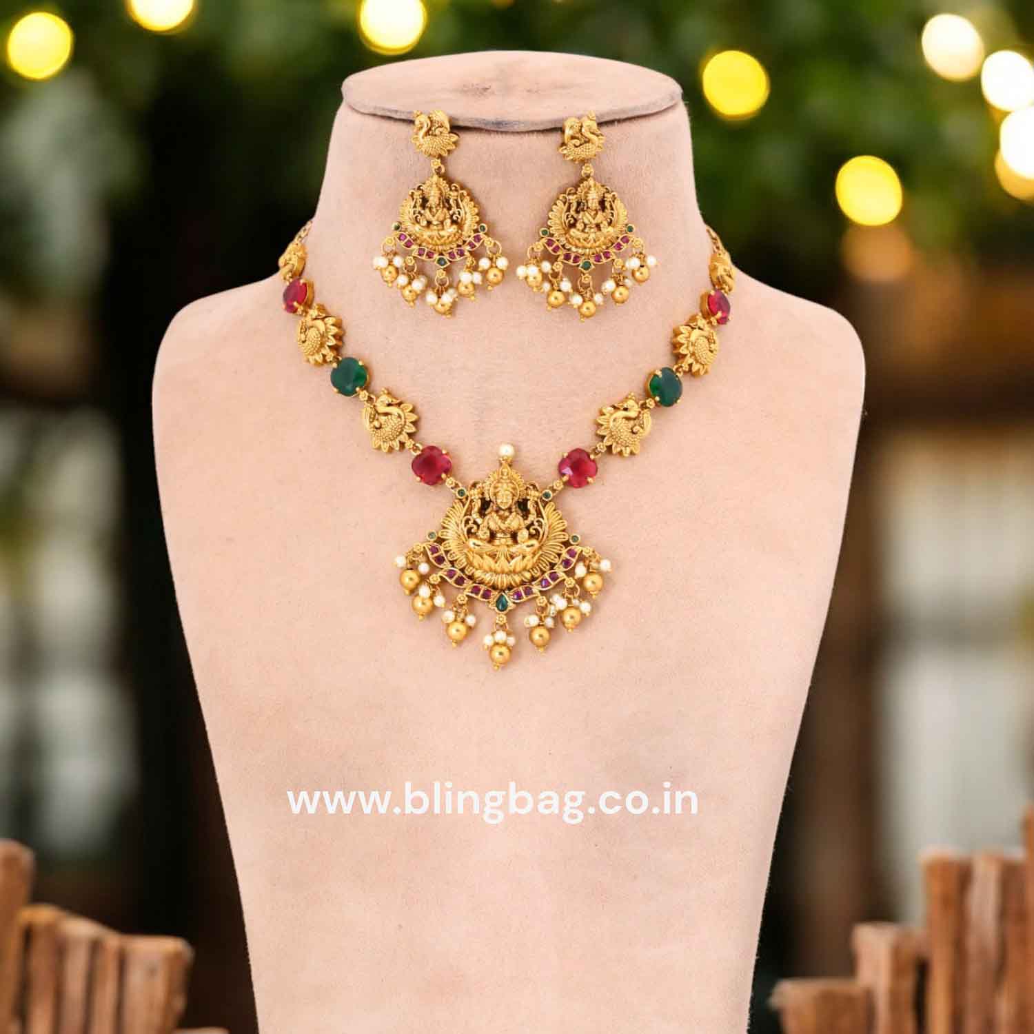 The temple necklace set epitomizes the grandeur and spiritual essence of Indian heritage, blending divine motifs with exquisite craftsmanship. Crafted with precision, each piece in the set showcases a harmonious blend of tradition and elegance.