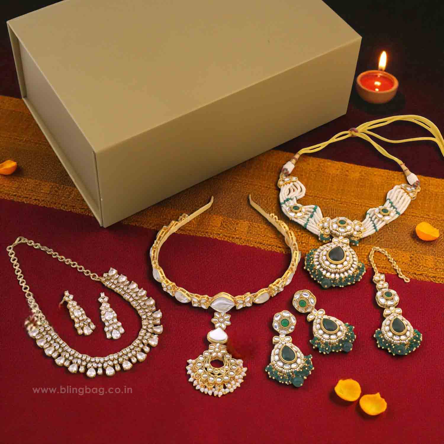 Each piece in this box is handcrafted with precision, blending traditional artistry with modern charm — a perfect treasure for brides, bridesmaids, or festive gifting.