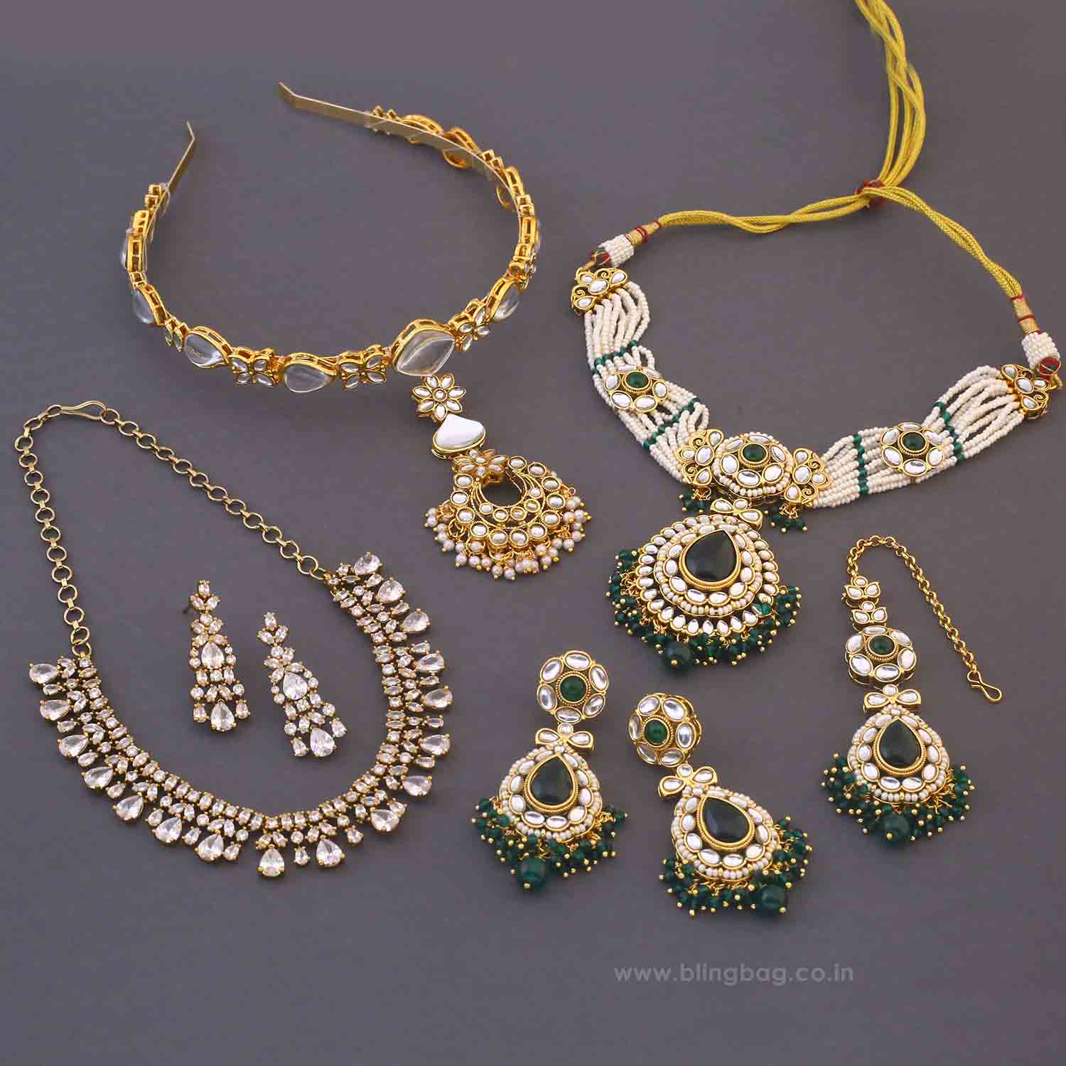 🌸 Style Tip: Pair the green kundan set with your bridal lehenga, and the choker or necklace for lighter pre-wedding events.