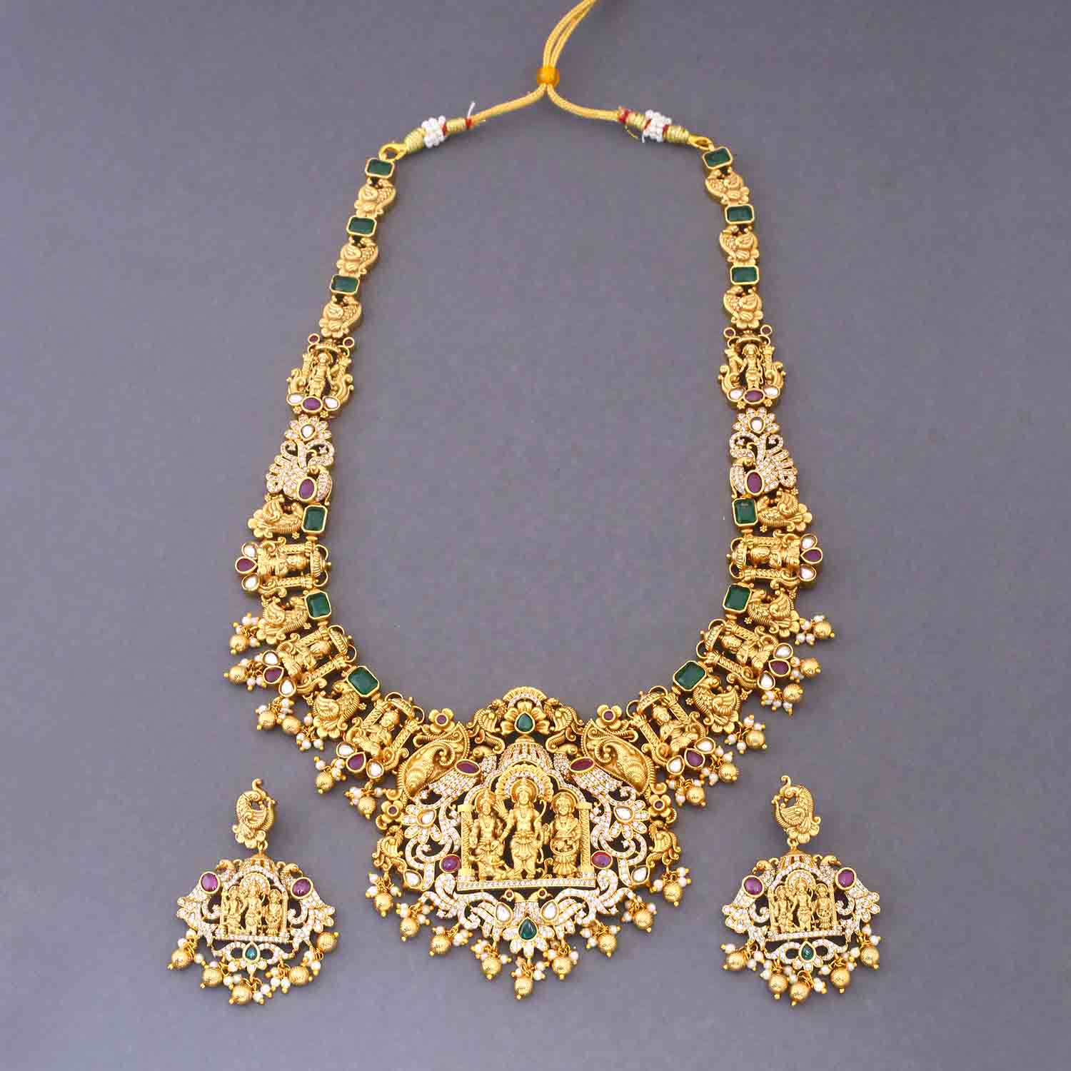 The temple necklace set epitomizes the grandeur and spiritual essence of Indian heritage, blending divine motifs with exquisite craftsmanship. Crafted with precision, each piece in the set showcases a harmonious blend of tradition and elegance.