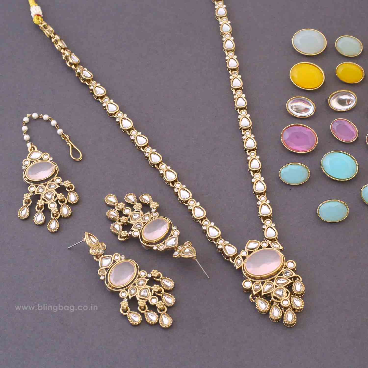 This elegant jewellery set features a long statement neckpiece paired with matching earrings and a tikka. The design highlights oval and teardrop-shaped stones arranged in a classic pattern, with detachable stone options that allow easy customization for different outfits. Delicate dangling accents add movement and a festive charm, making the set versatile for multiple occasions.