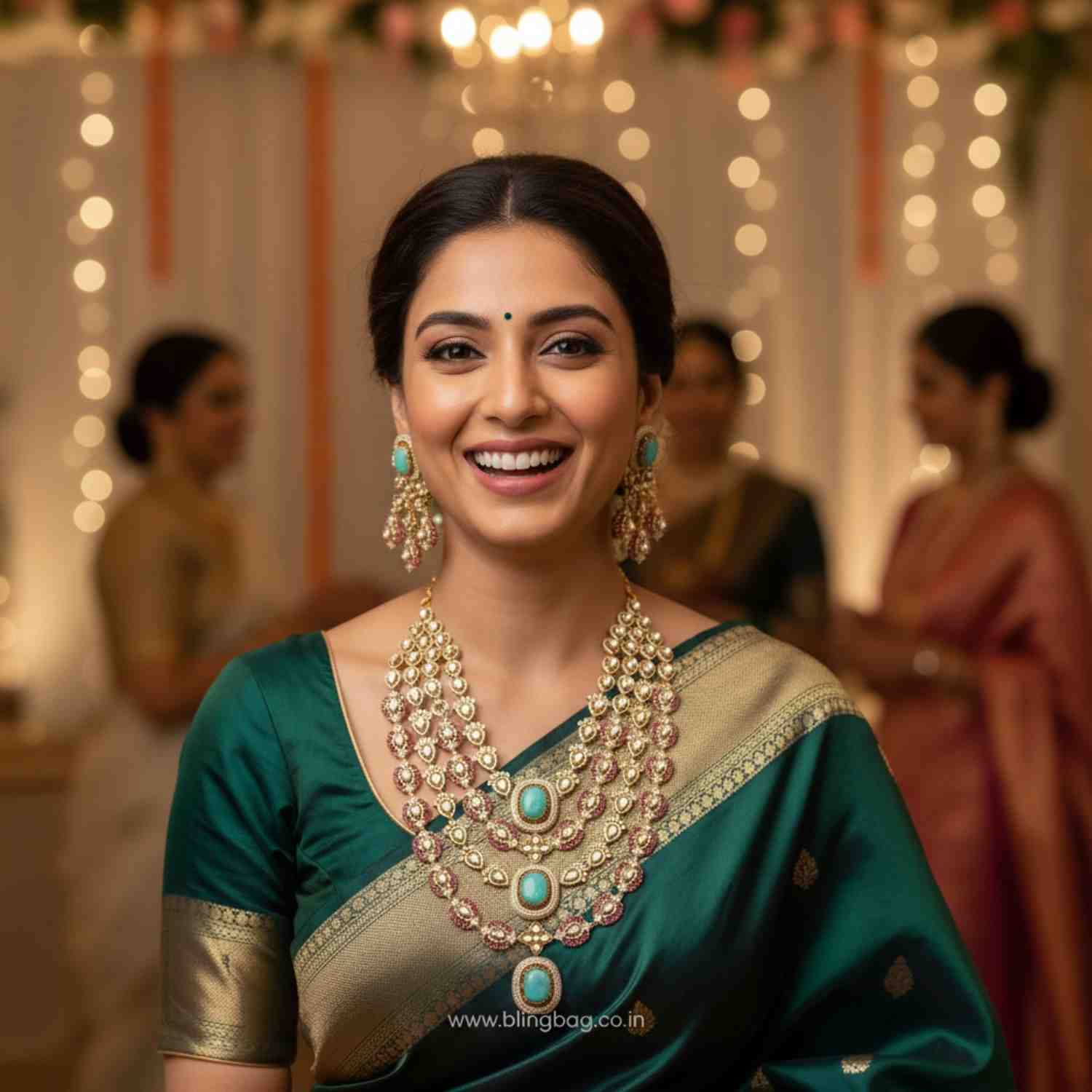 Pair with solid silk sarees or bridal lehengas in ivory, wine, or emerald tones and keep the blouse neckline simple to let the layers shine.