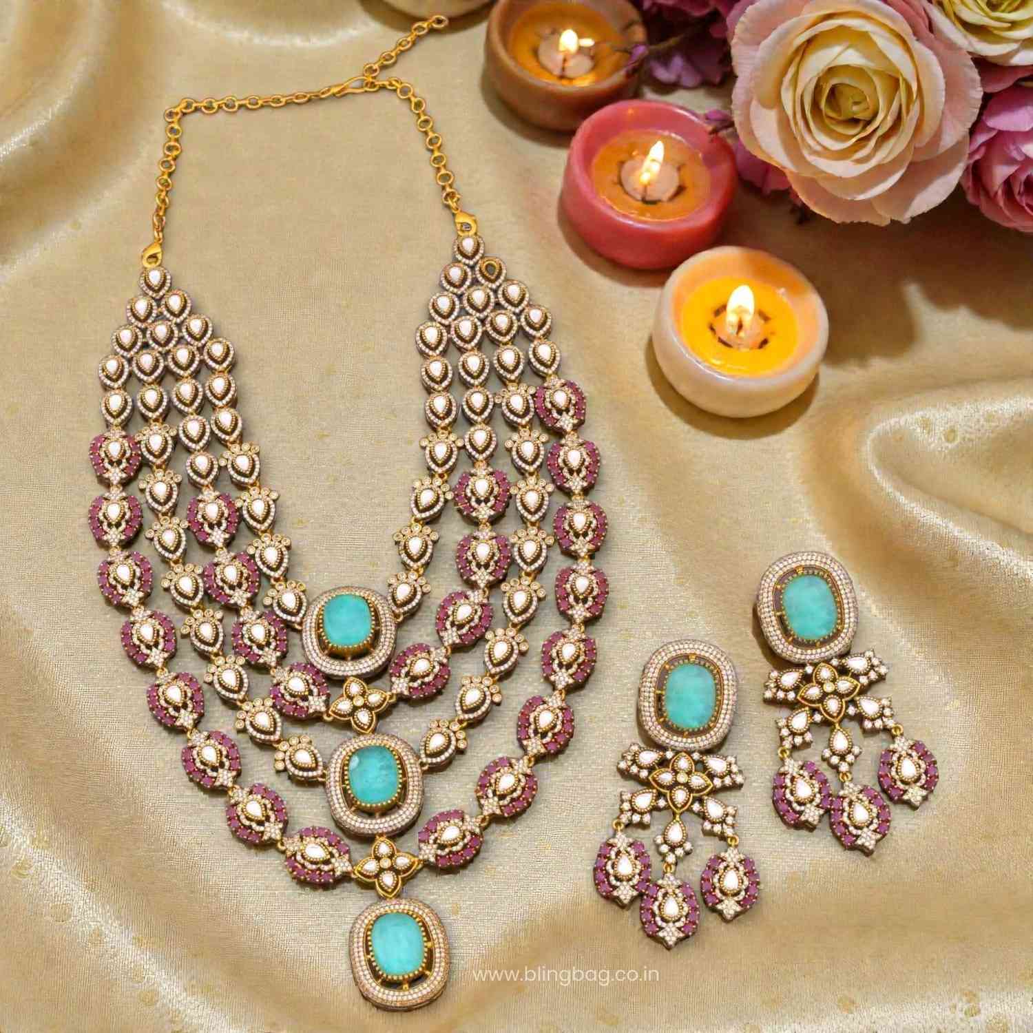 This opulent layered Victorian necklace set features striking turquoise centerpiece stones, accented with ruby hues, kundan detailing, and a rich antique gold finish. The statement earrings perfectly complement the grandeur of the design.