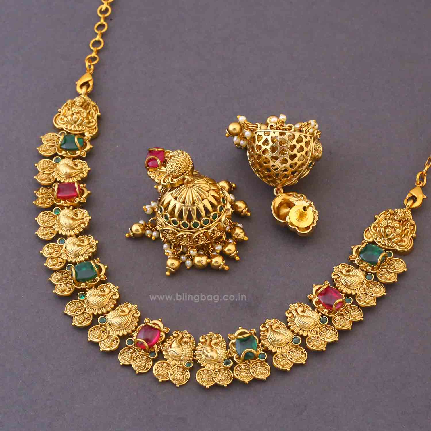 Pair this set with a traditional silk saree or a classic lehenga in deep or contrasting shades to create a graceful and festive look for weddings and celebrations.