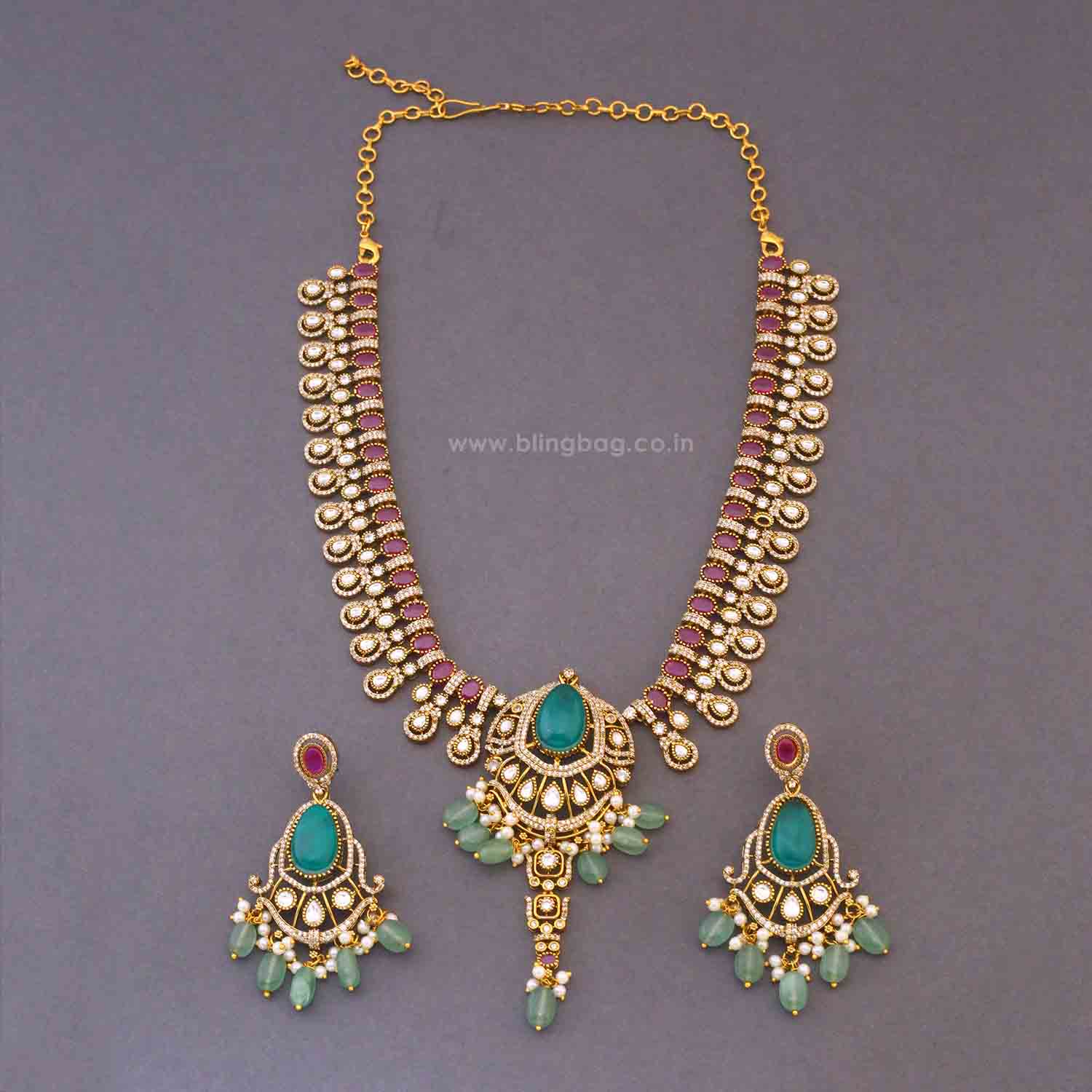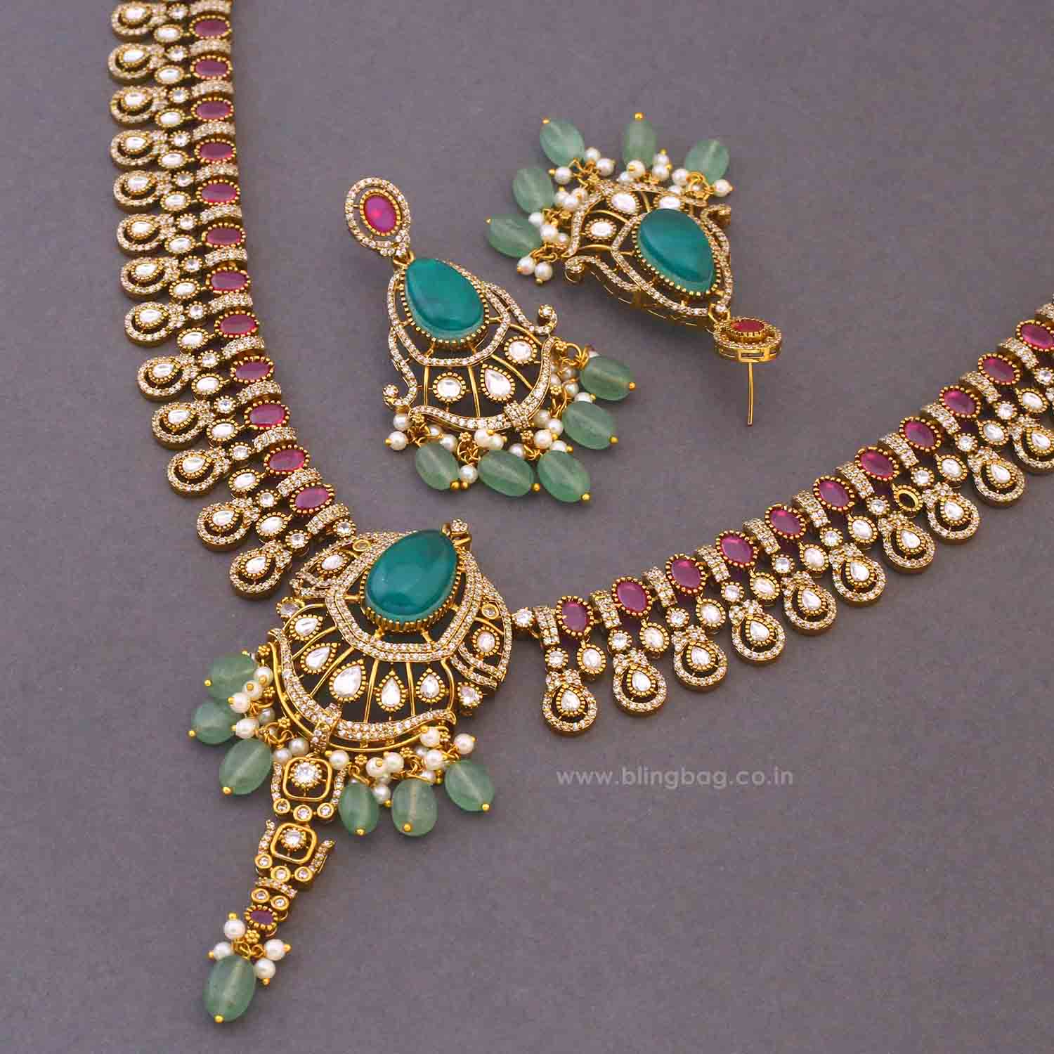 This elegant necklace set is ideal for festive and wedding occasions. The design showcases a neatly layered necklace adorned with green-toned center motifs, detailed stone work, and delicate pearl drops that add movement and charm. The matching earrings complete the set with a graceful traditional appeal.