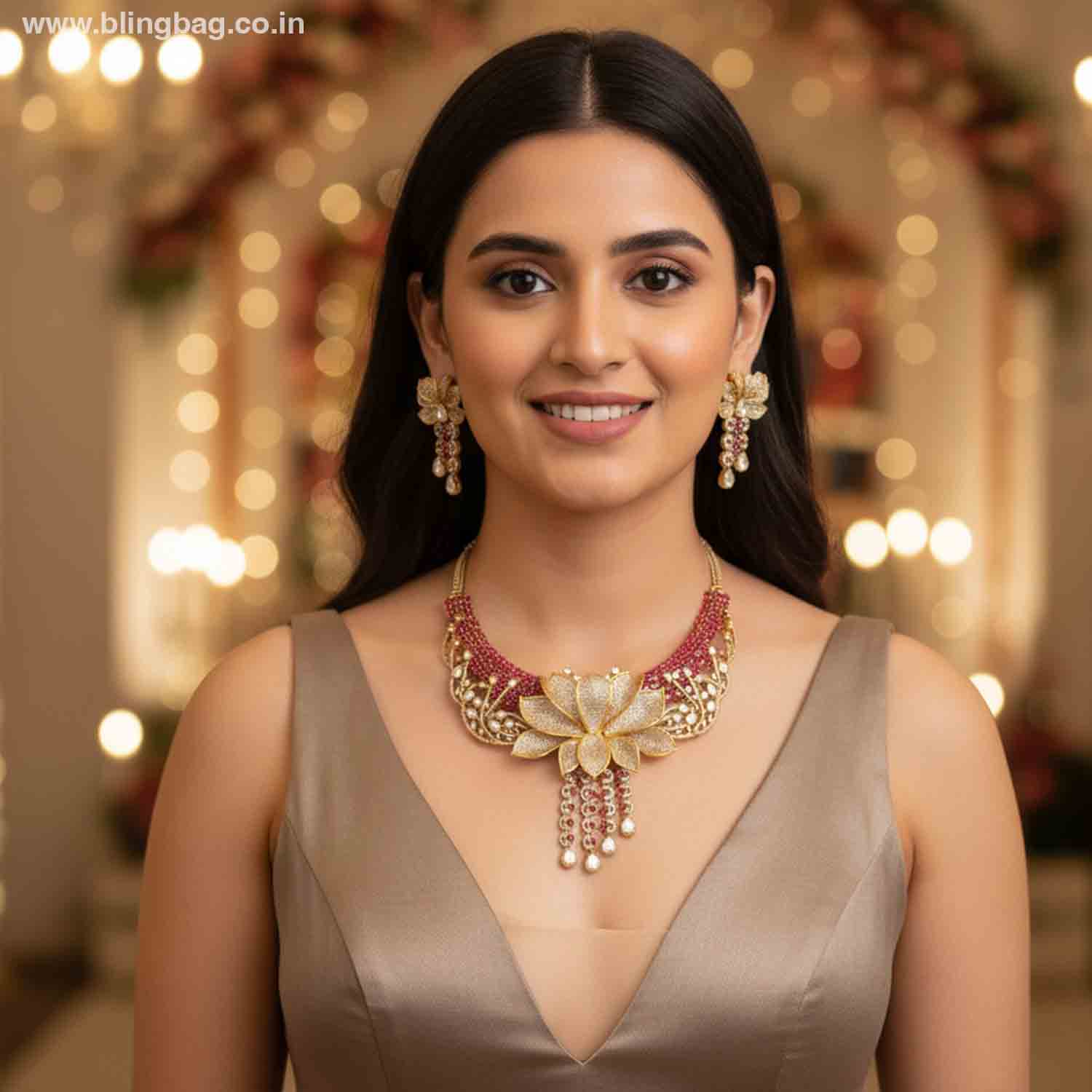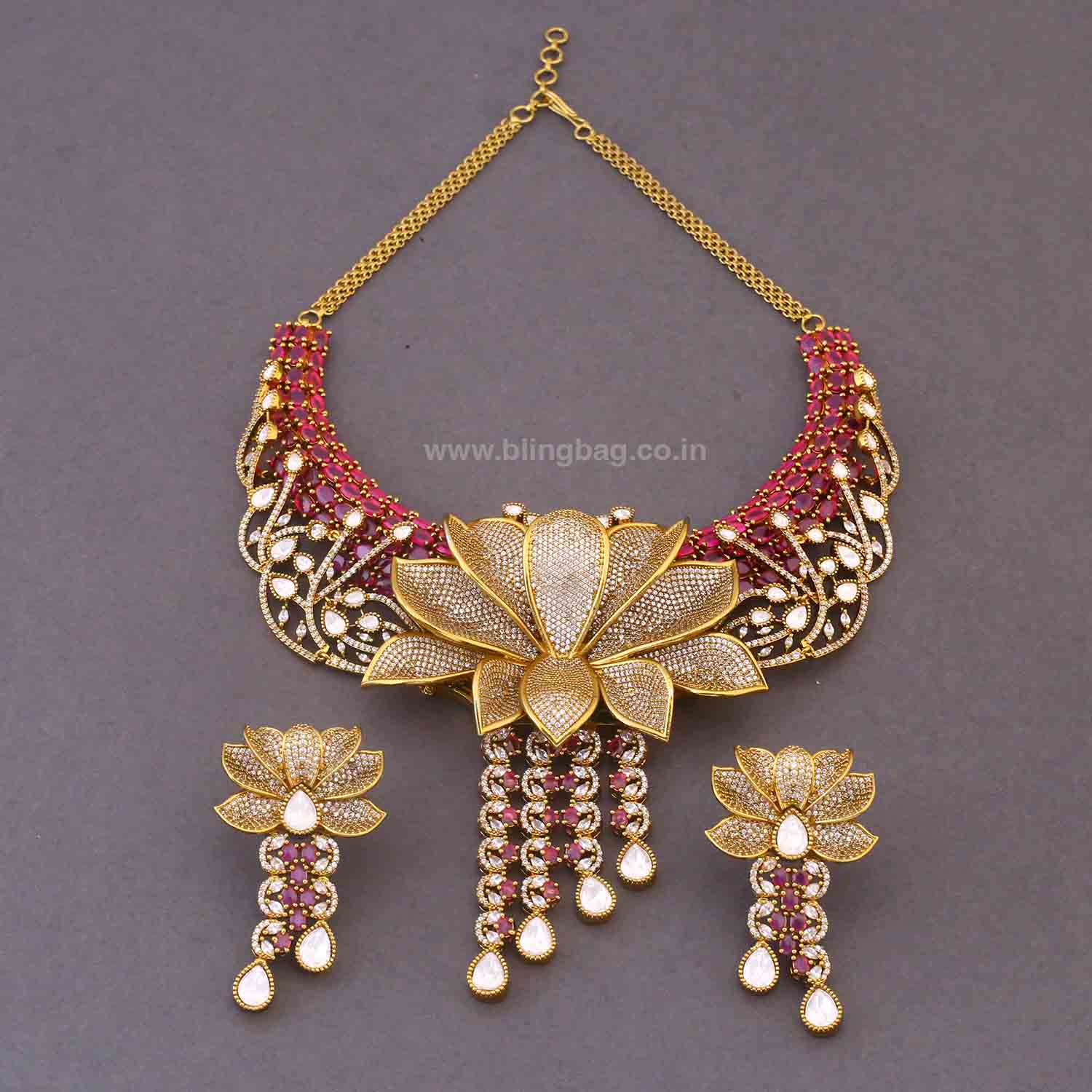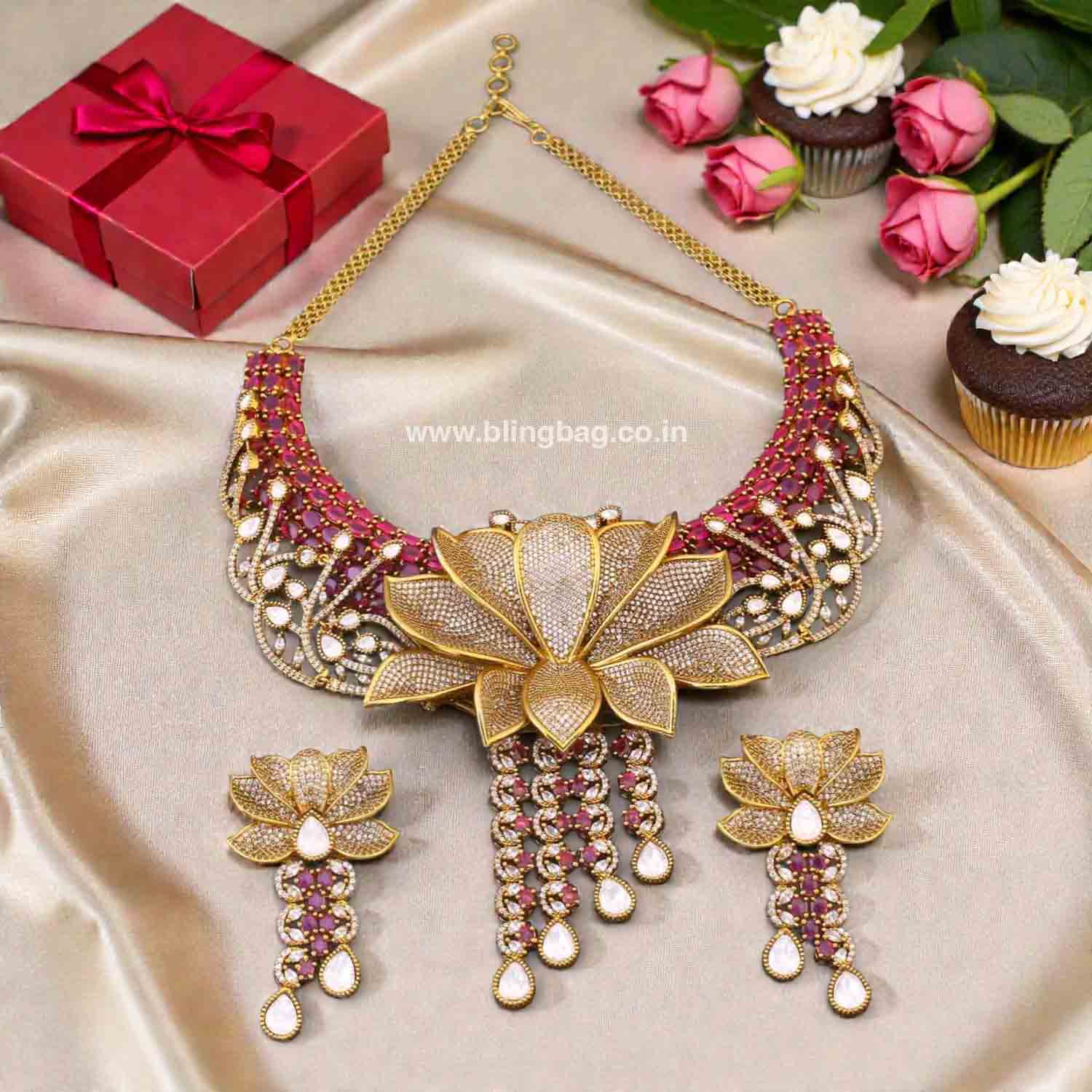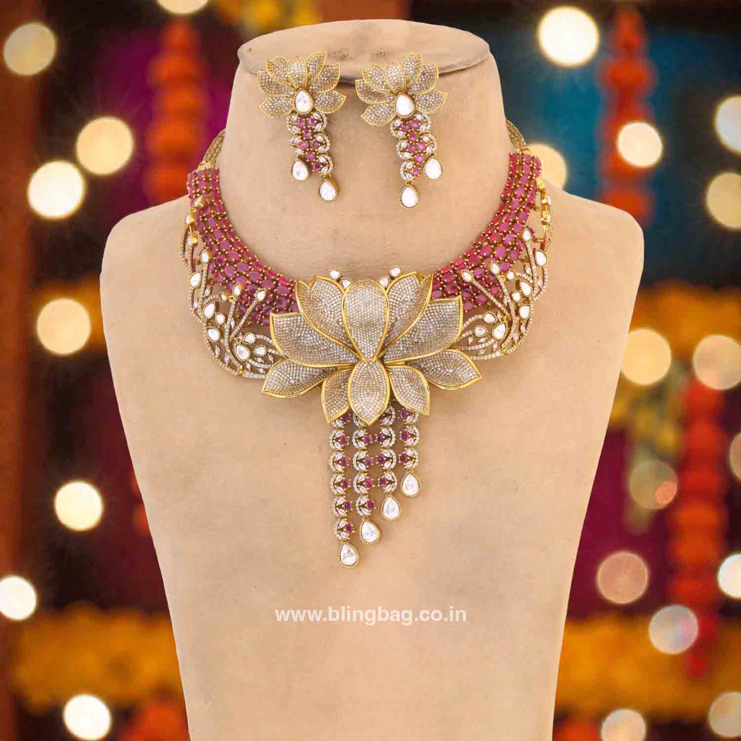This exquisite Victorian-style jewellery set features a grand lotus-inspired gold-tone hasli necklace adorned with sparkling kundan stones and rich pink accents. The statement floral pendant with cascading drops and matching earrings creates a luxurious and royal look, perfect for weddings and festive celebrations.