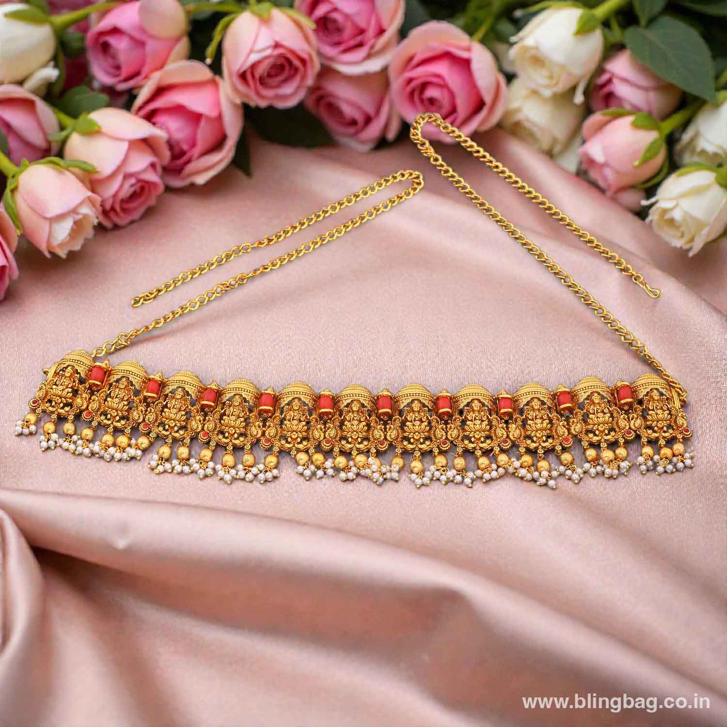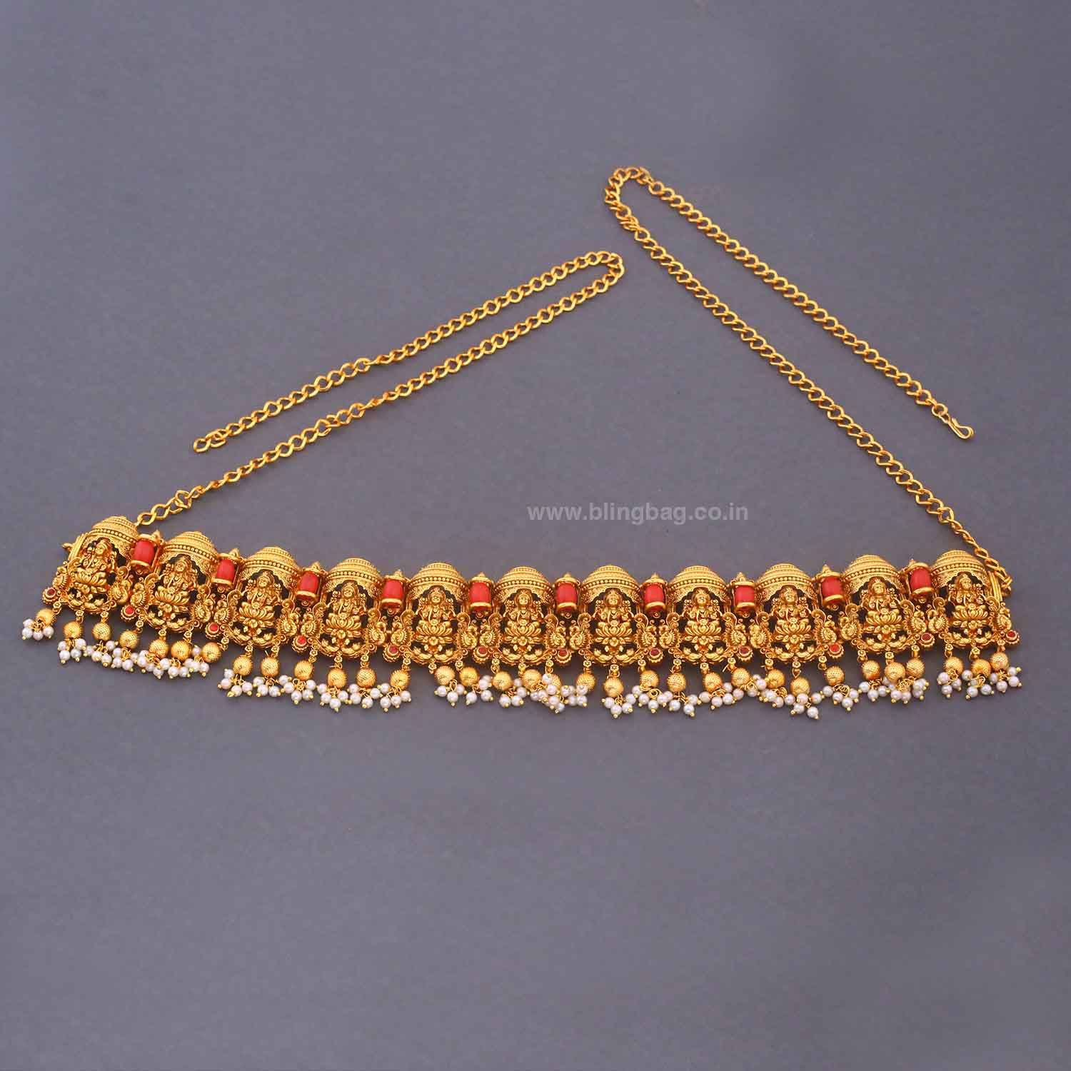 This traditional waist belt (Kamarbandh/Vaddanam) is beautifully crafted with intricate temple-style motifs highlighted by rich red accents. The design is further enhanced with delicate pearl hangings along the lower edge, adding elegance and graceful movement. The adjustable gold-tone chain ensures a comfortable and secure fit.
