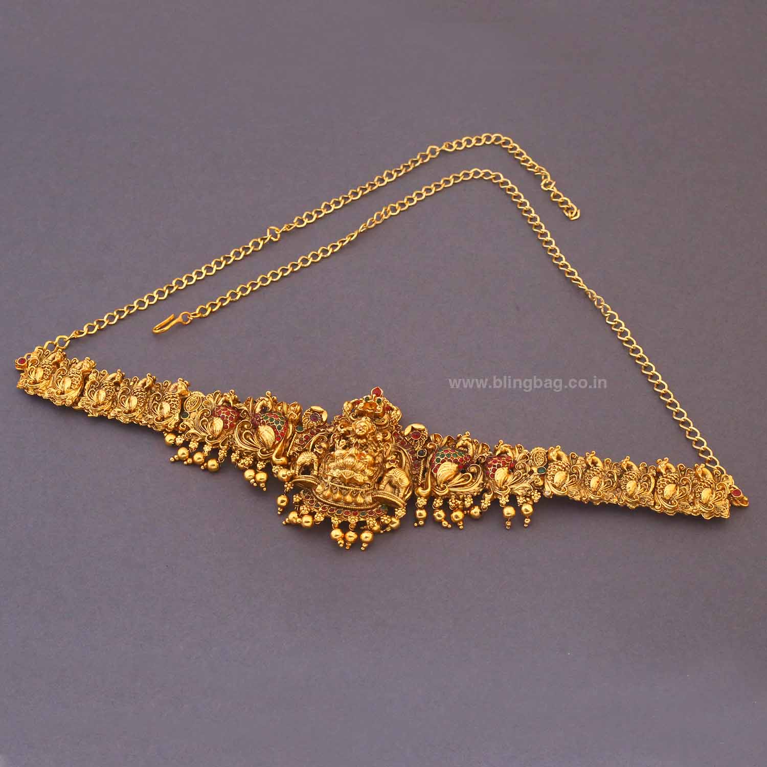 An elaborately crafted waist belt featuring a majestic central goddess motif with intricate carvings and rich detailing.