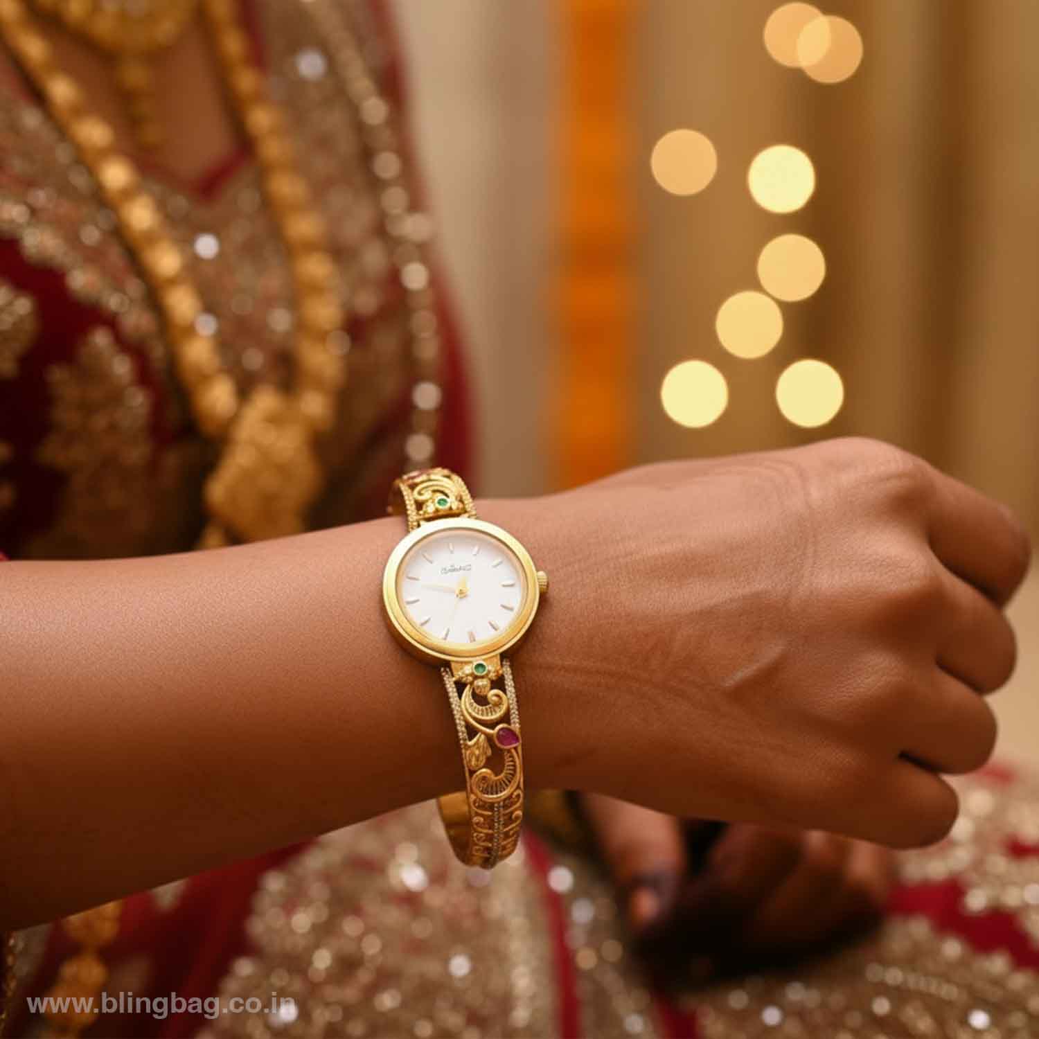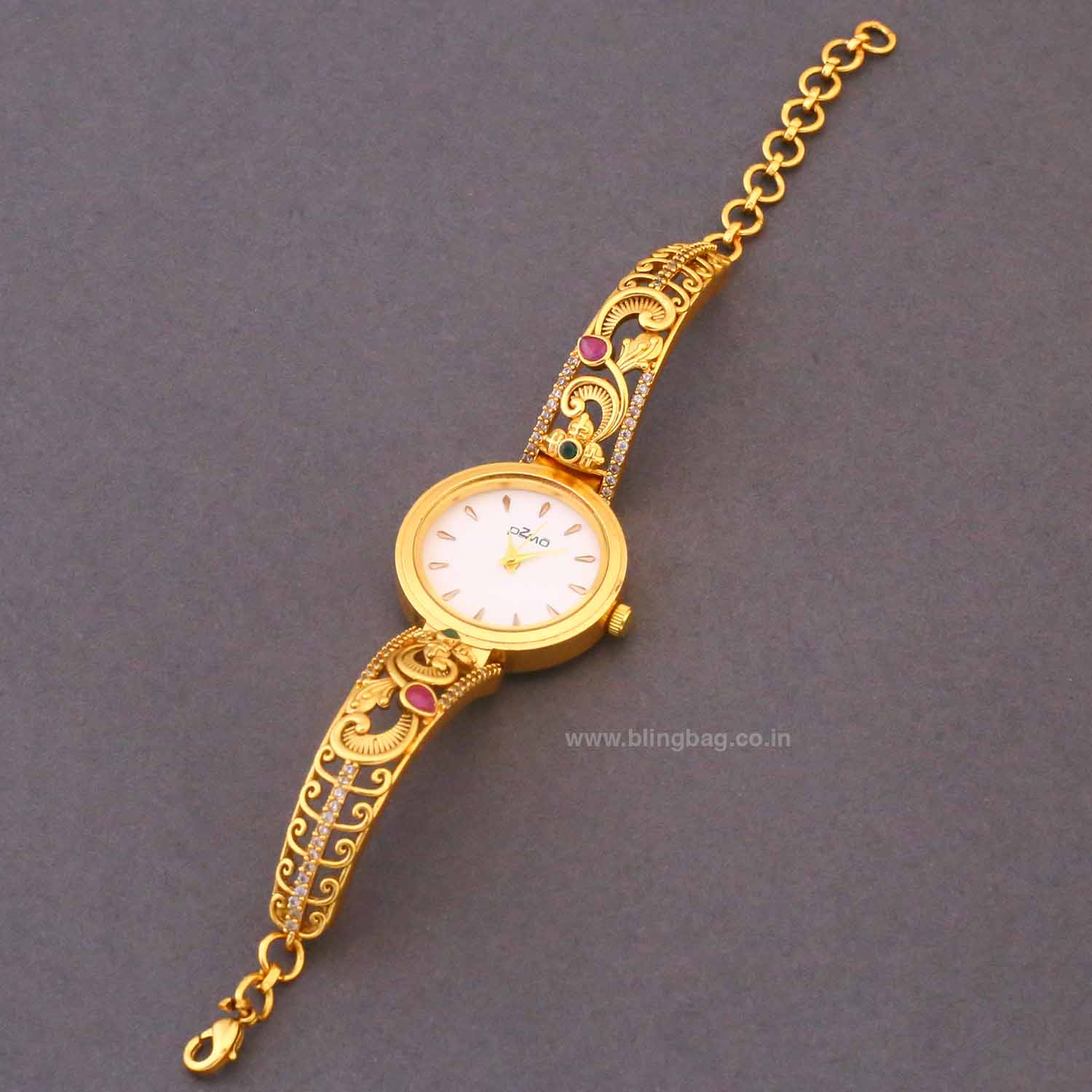 This graceful gold-toned heritage bracelet watch features a clean white dial paired with an intricately carved strap adorned with pink and green stone accents. Its elegant traditional design adds a royal touch to your festive and ethnic looks.