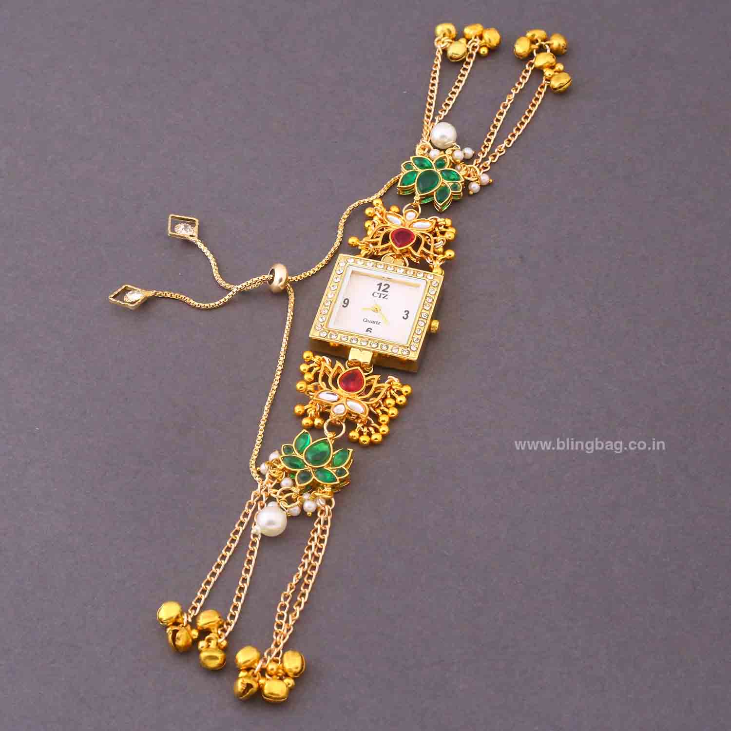 Features a clean, square-shaped watch face framed by a sparkling crystal-studded bezel. Showcases ornate floral designs highlighted with vibrant green and red enamel detailing Embellished with delicate gold-toned ghungroo bells at the ends of the bracelet for a traditional, auditory touch
