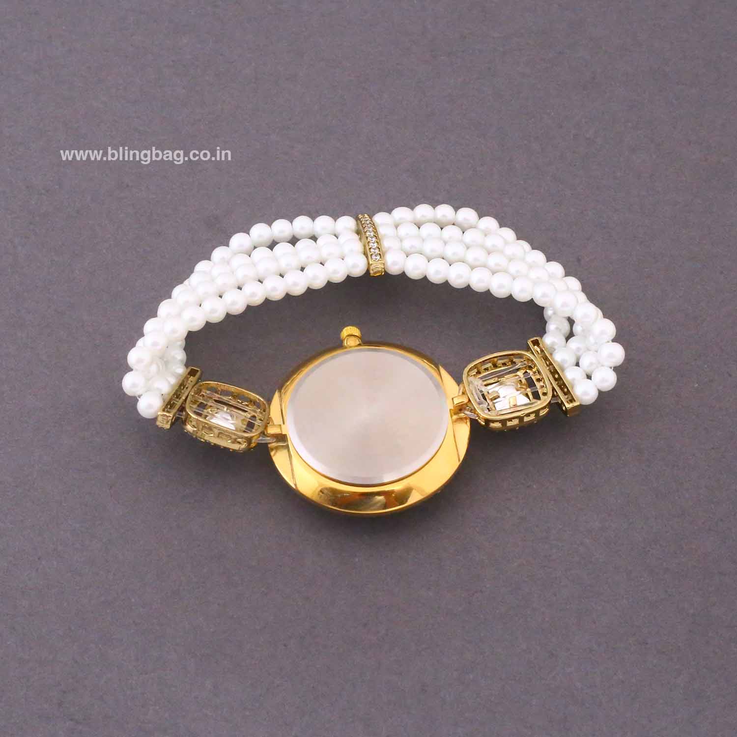 This elegant timepiece blends the charm of fine jewelry with everyday functionality. Designed with multiple strands of lustrous white pearls, the bracelet-style strap creates a rich, layered look. The gold-toned dial is encircled with sparkling stone embellishments, giving it a luxurious, festive appeal. Intricate kundan-style detailing on the connectors adds a traditional touch, making the watch feel like a statement accessory rather than just a timekeeper. The minimal dial keeps it classy, while the overall design exudes grace and sophistication.