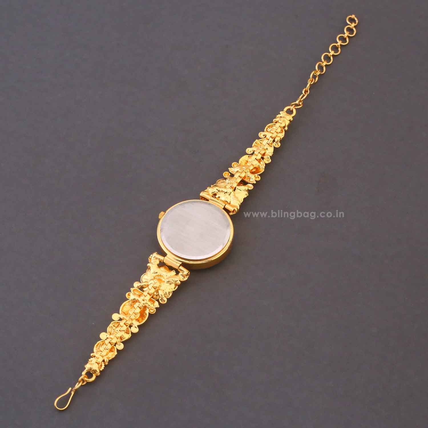 Exude sophistication with this stunning gold-toned bracelet watch, blending traditional artistry with modern allure. The watch features a rich black dial that enhances the golden hour markers and hands, creating a striking contrast. The intricately designed bracelet is adorned with floral motifs and highlighted by pink and turquoise stones, adding a regal touch. Perfect for festive occasions, cultural celebrations, or elegant gifting.