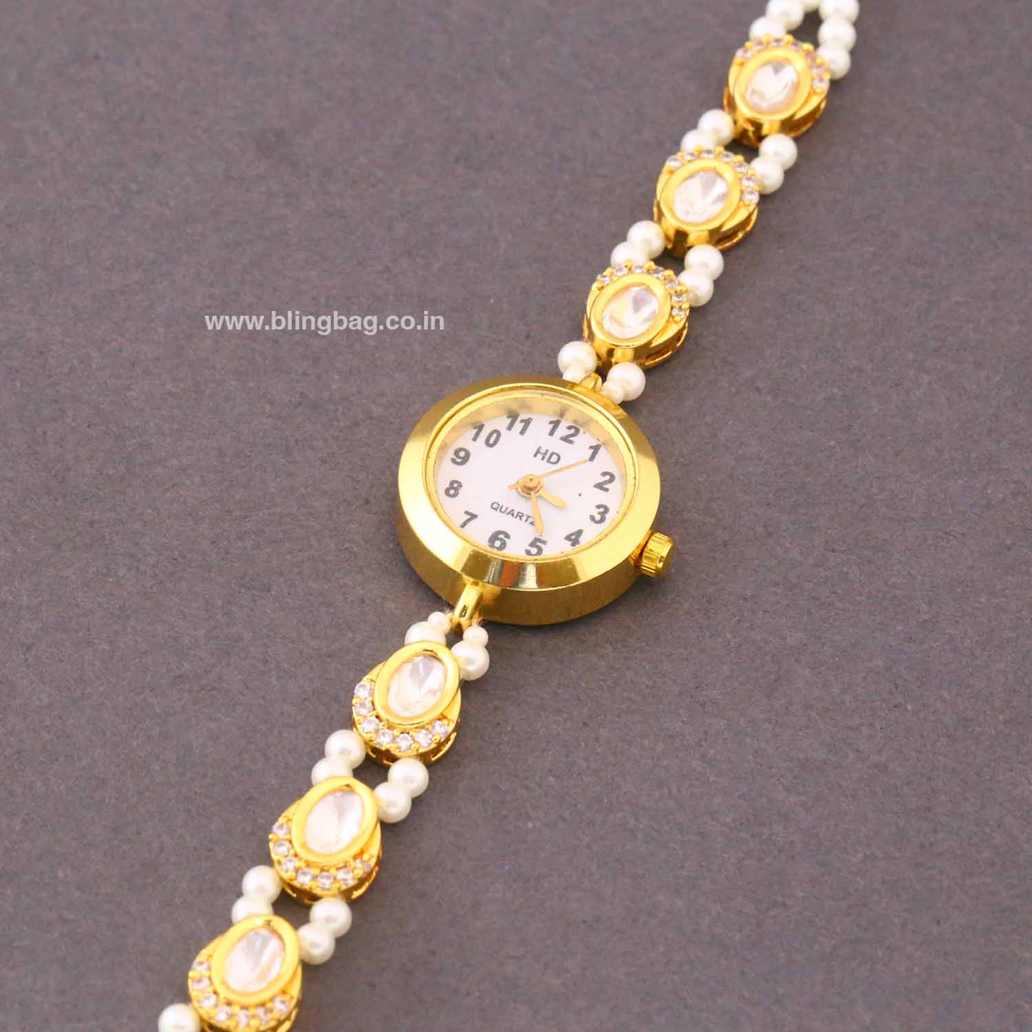 This elegant bracelet watch blends traditional charm with modern functionality. Crafted in a rich gold-tone finish, it features a round dial with clear numerals for easy readability. The strap is beautifully designed with delicate pearl beads and oval kundan-style stones, adding a luxurious ethnic touch. The combination of gold, pearls, and subtle sparkle makes it both a timepiece and a statement accessory.