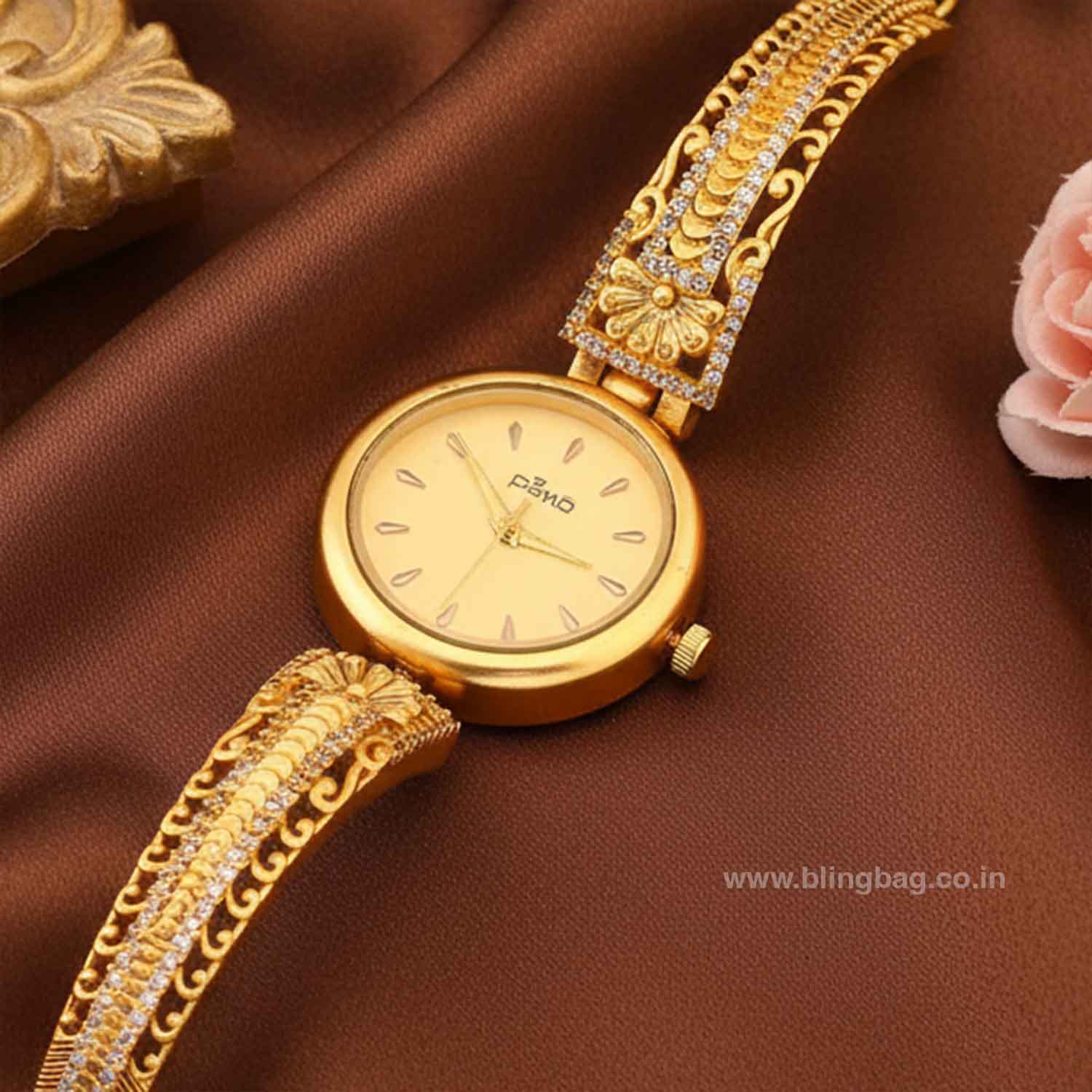 This elegant gold-toned bracelet watch features a minimal round dial paired with an intricately designed stone-studded strap. Its graceful blend of simplicity and traditional craftsmanship makes it perfect for festive and everyday ethnic wear.