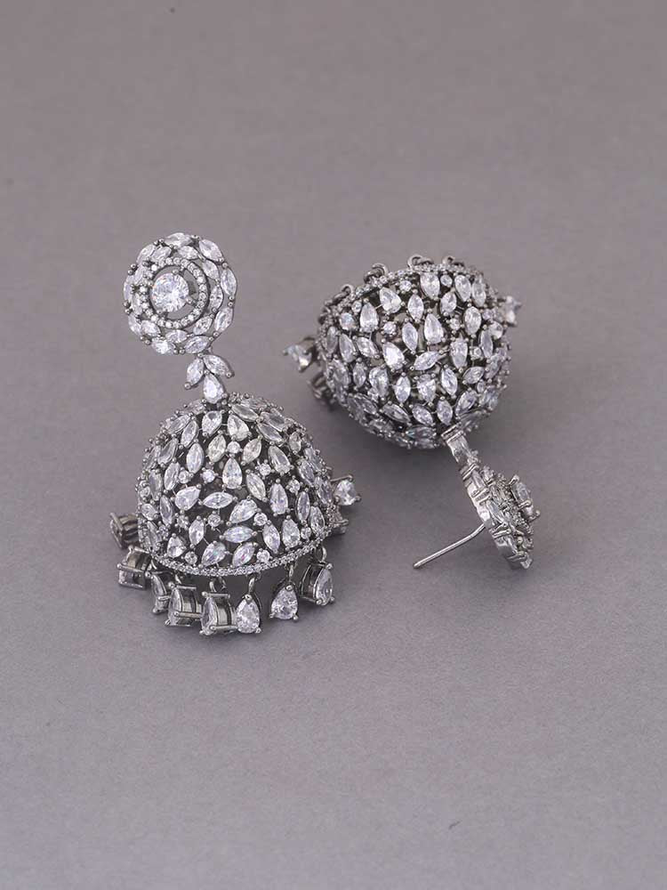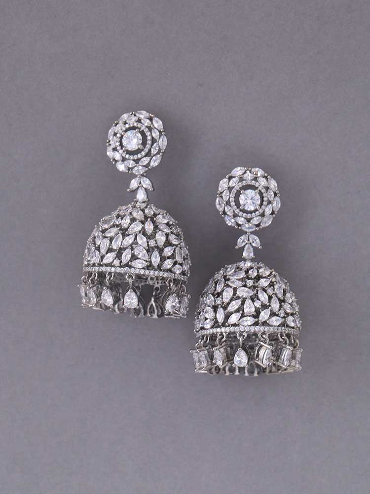 This pair of elegant jhumkis have a beautiful American Diamond set up. The jhumkis will glimmer and grab all the attention at the next big party. These earrings also have a delicate floral motif on top of it. The jhumkis are a perfect option for the festive season