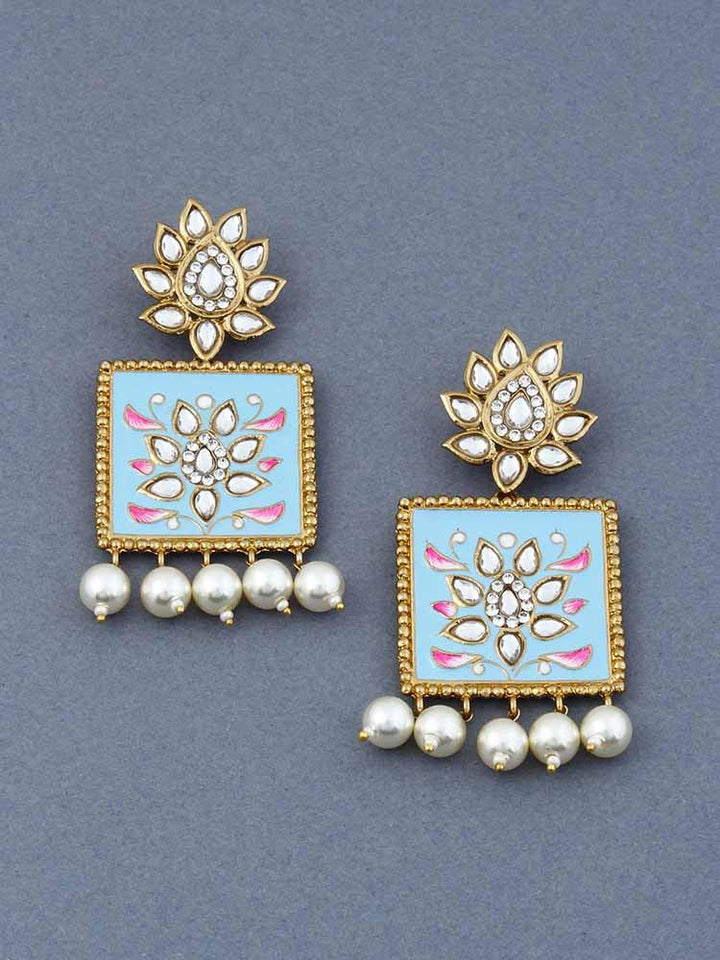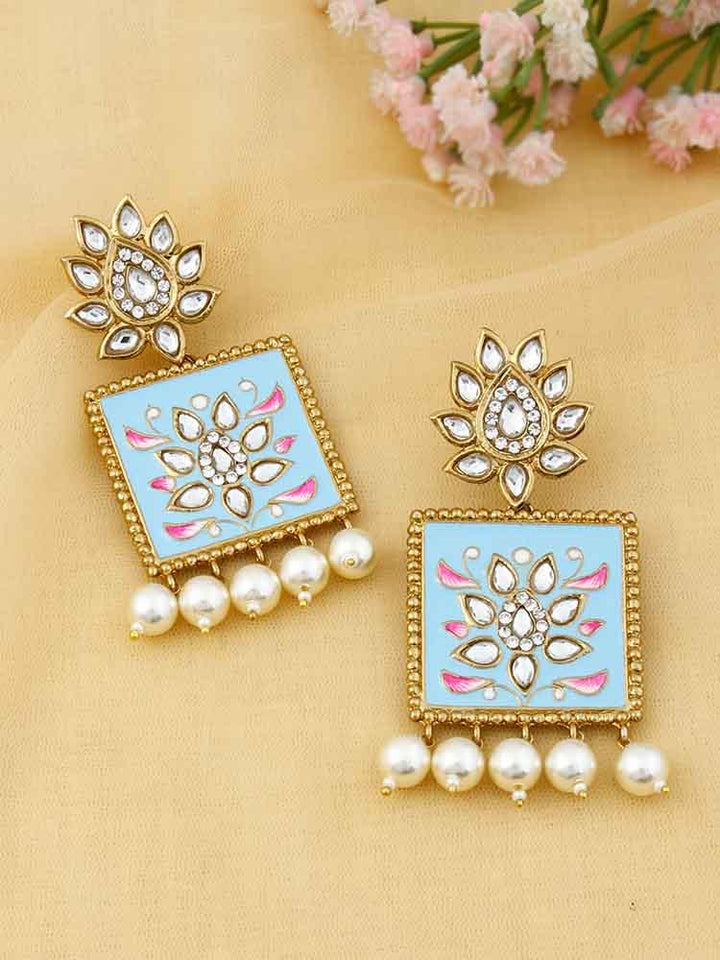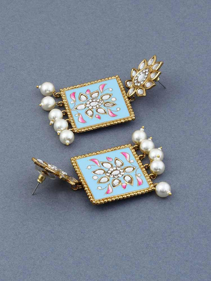 Mint Kalavati Designer Earrings are an Alloy, Kundan, Crystal, Pearls based earring set. This set has an aqua blue and golden look. The earrings set has a beautiful kundan and blue detailing and pearls at the bottom. This accessory has a stunning and vibrant look.
