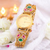 Enhance your style with the Bling Bag Gold-Plated Stone-Studded Quartz Watch, incorporating a regal touch. The watch boasts a refined gold-tone finish and is embellished with vibrant stones, effortlessly captivating attention. Combining the elements of both a watch and jewelry, this masterpiece is perfect for those who appreciate a daring and elegant aesthetic.