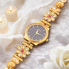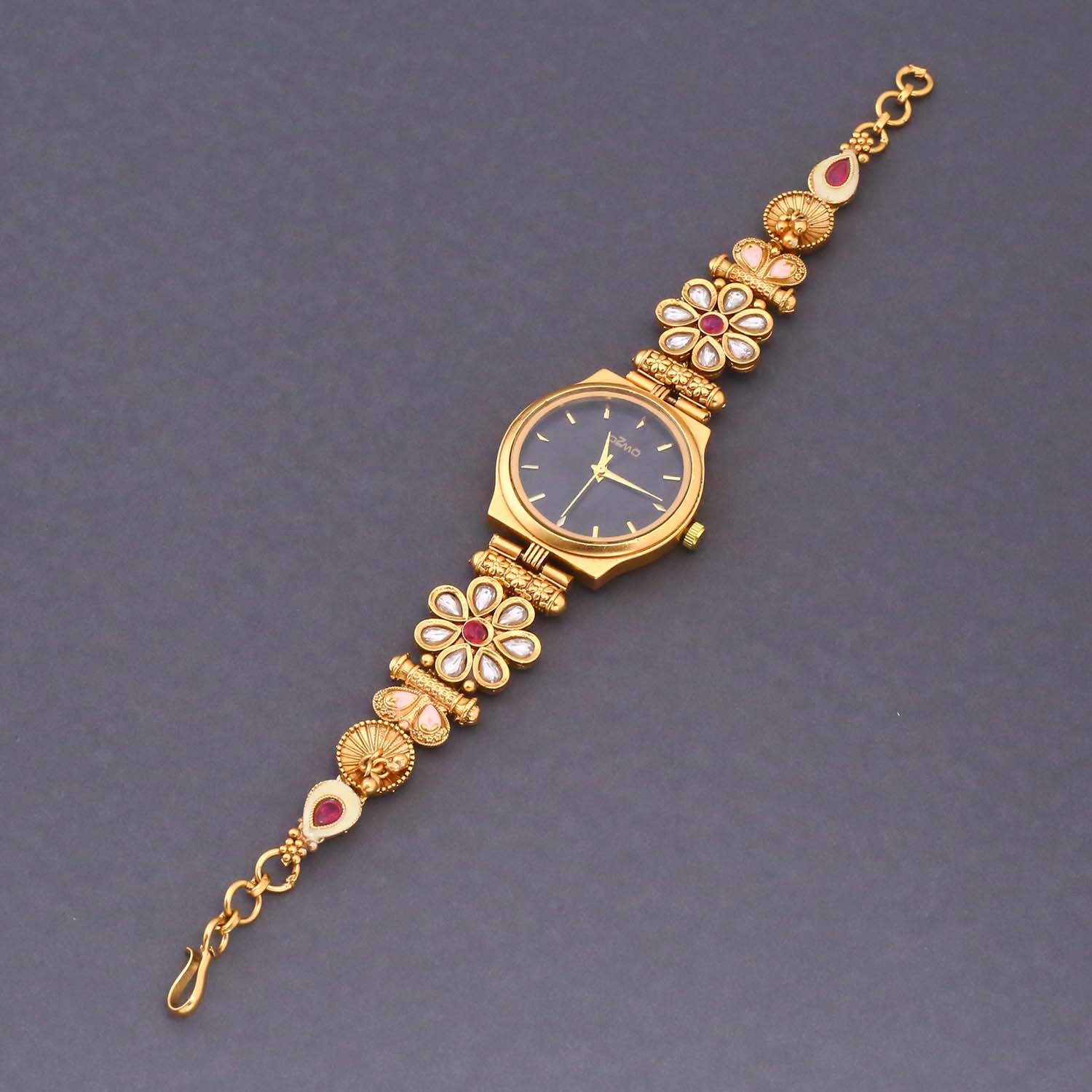 Enhance your style with the Bling Bag Royal Black Dial Bridal Watch, incorporating a regal touch. The watch boasts a refined gold-tone finish and is embellished with vibrant stones, effortlessly captivating attention. Combining the elements of both a watch and jewelry, this masterpiece is perfect for those who appreciate a daring and elegant aesthetic.