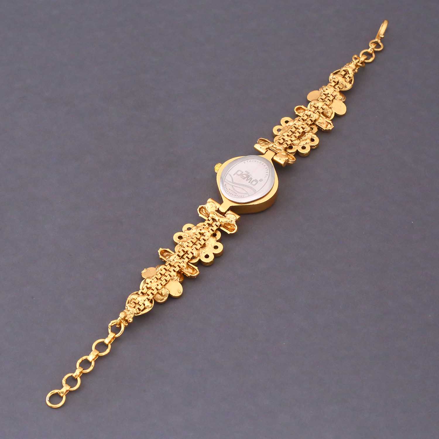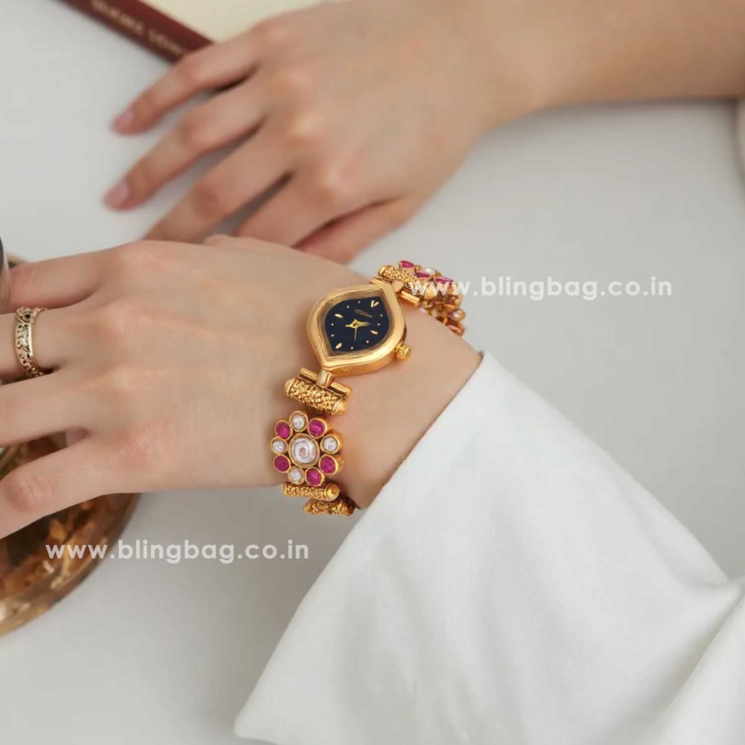 Celebrate the beauty of tradition with the Blingbag Kundan Bloom Floral Dial Watch. Designed with intricate motifs, this watch features kundan embellishments in vibrant red and green, highlighted with delicate pearl accents. The round golden bezel frames a minimalistic dial, blending simplicity with grandeur. Its jewelry-inspired strap makes it a statement piece for weddings, festive celebrations, and ethnic ensembles.