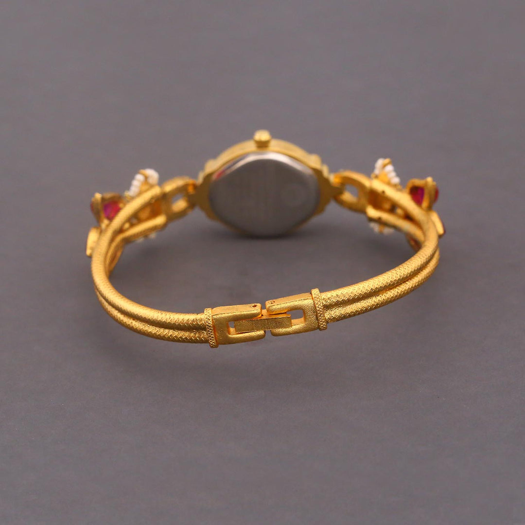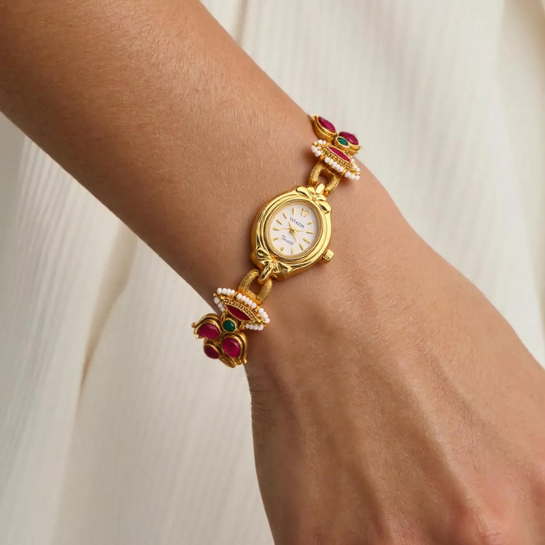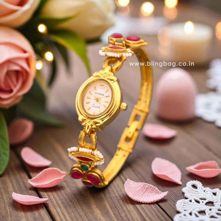 Enhance your style with the Blingbag Lotus Roman Charm Gold Bracelet Watch, incorporating a regal touch. The watch boasts a refined gold-tone finish and is embellished with vibrant stones, effortlessly captivating attention. Combining the elements of both a watch and jewelry, this masterpiece is perfect for those who appreciate a daring and elegant aesthetic.