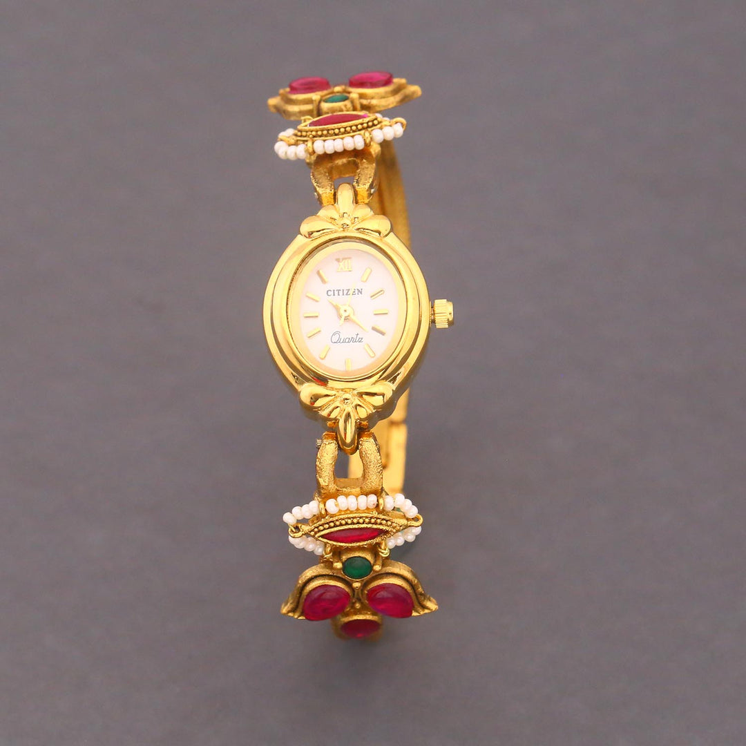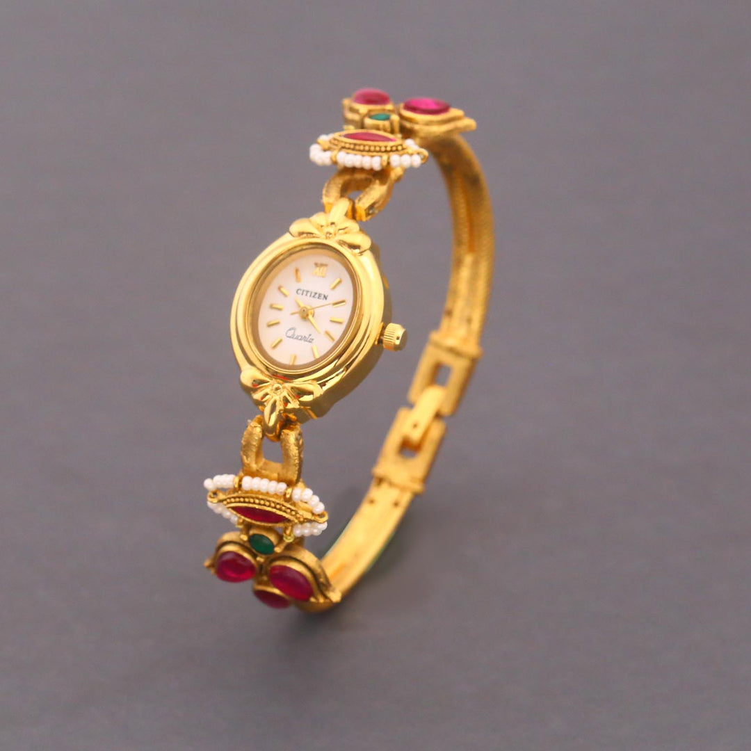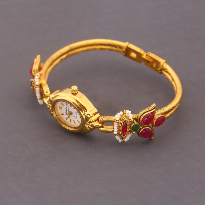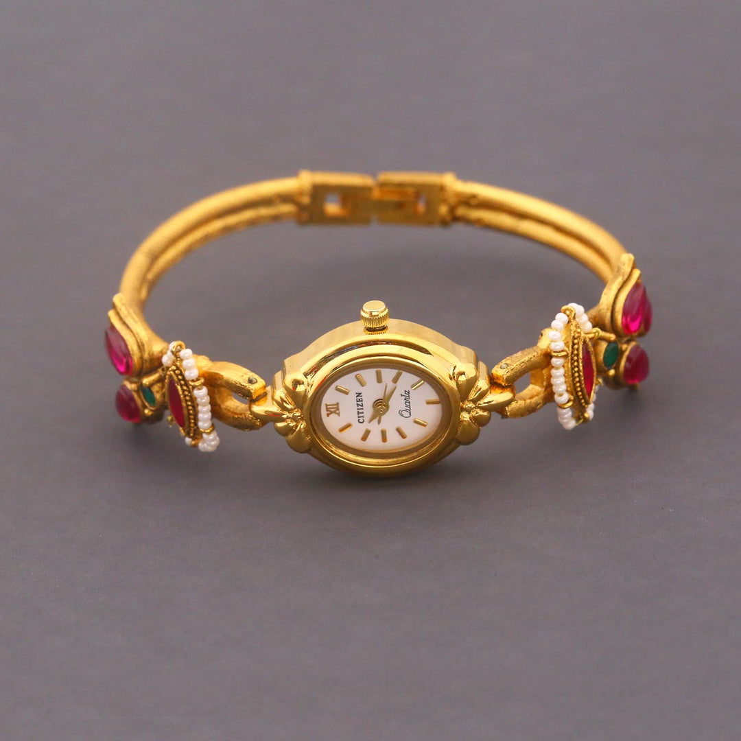 Enhance your style with the Blingbag Lotus Roman Charm Gold Bracelet Watch, incorporating a regal touch. The watch boasts a refined gold-tone finish and is embellished with vibrant stones, effortlessly captivating attention. Combining the elements of both a watch and jewelry, this masterpiece is perfect for those who appreciate a daring and elegant aesthetic.