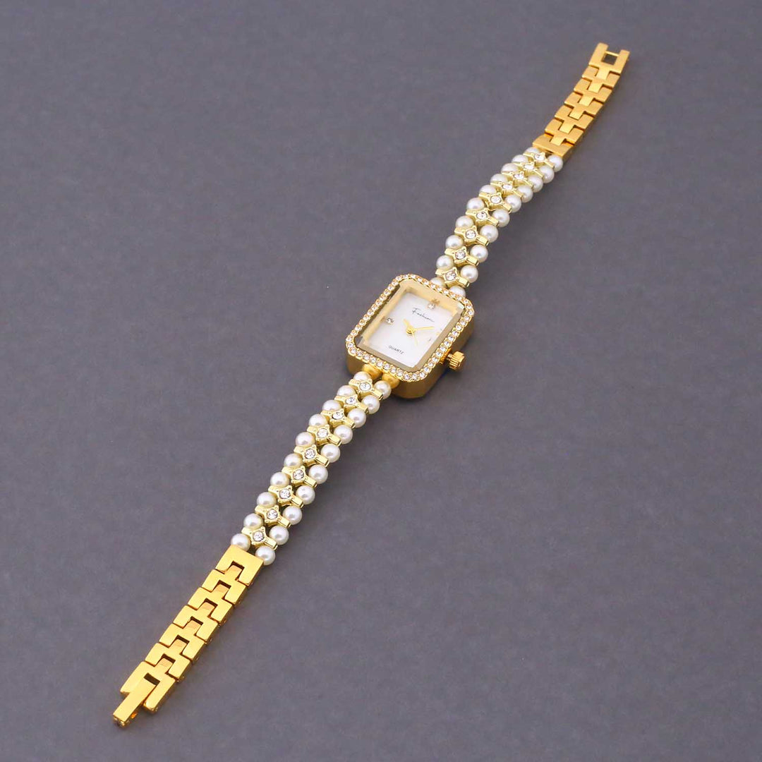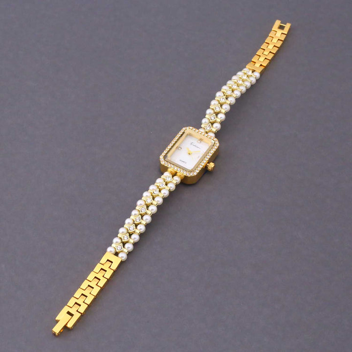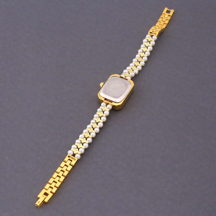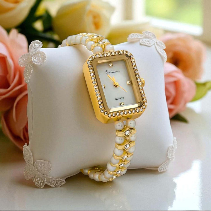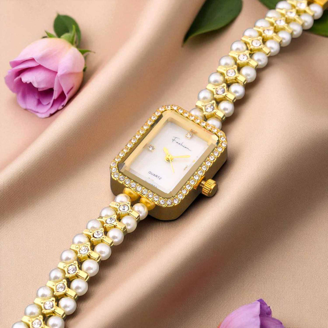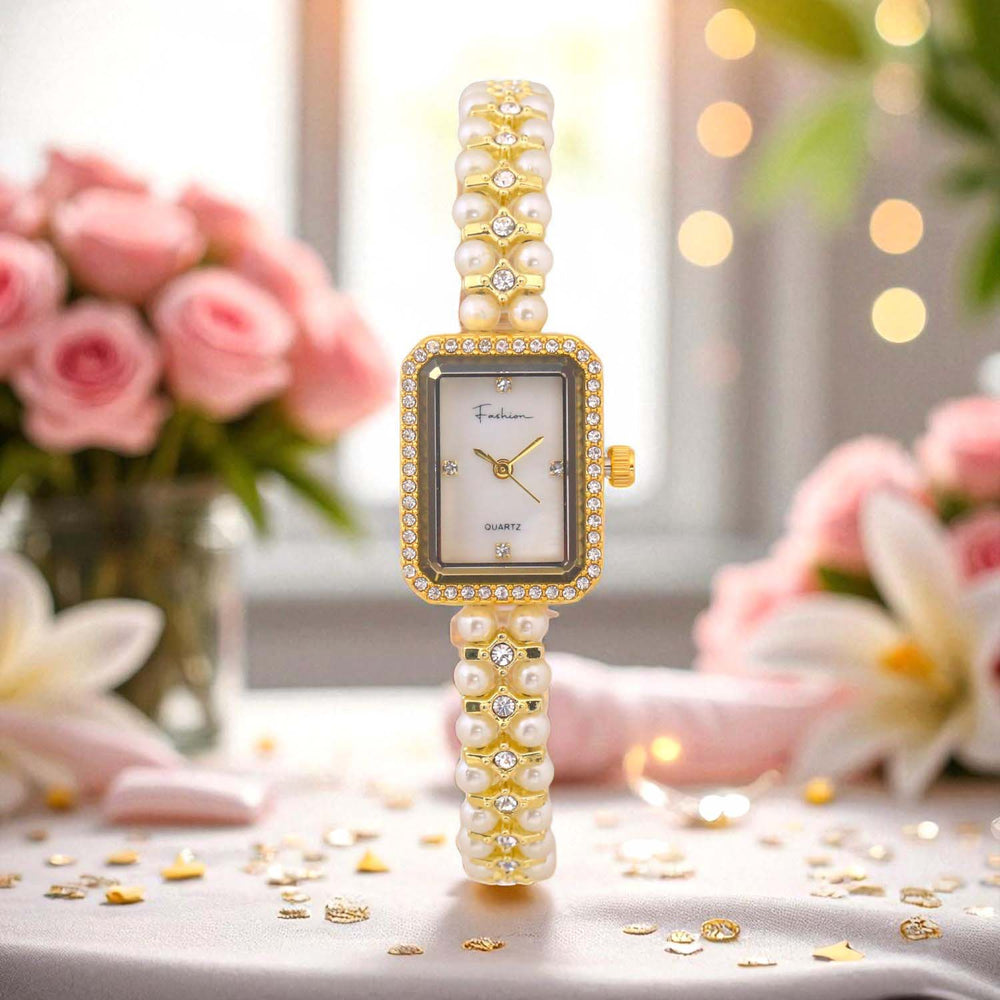 Elevate your wrist game with the Blingbag Pearl Elegance Crystal Dial Watch — a true blend of tradition and luxury. Featuring a square dial adorned with sparkling crystals and a strap crafted from lustrous pearls and gold-toned links, this watch is perfect for festive occasions, weddings, and special celebrations.