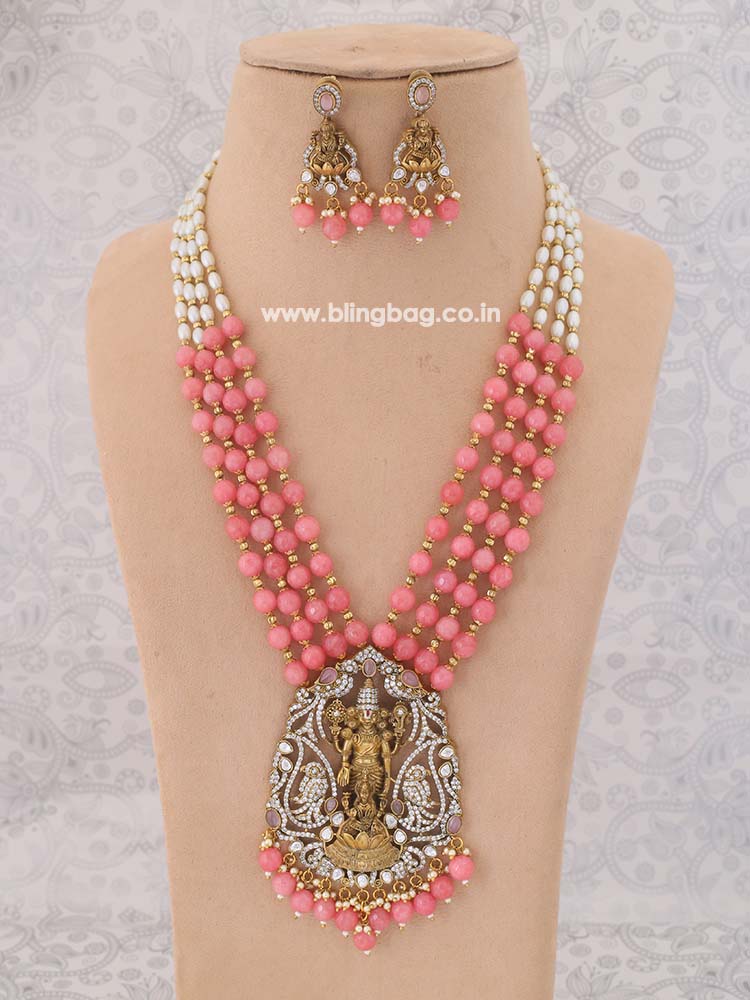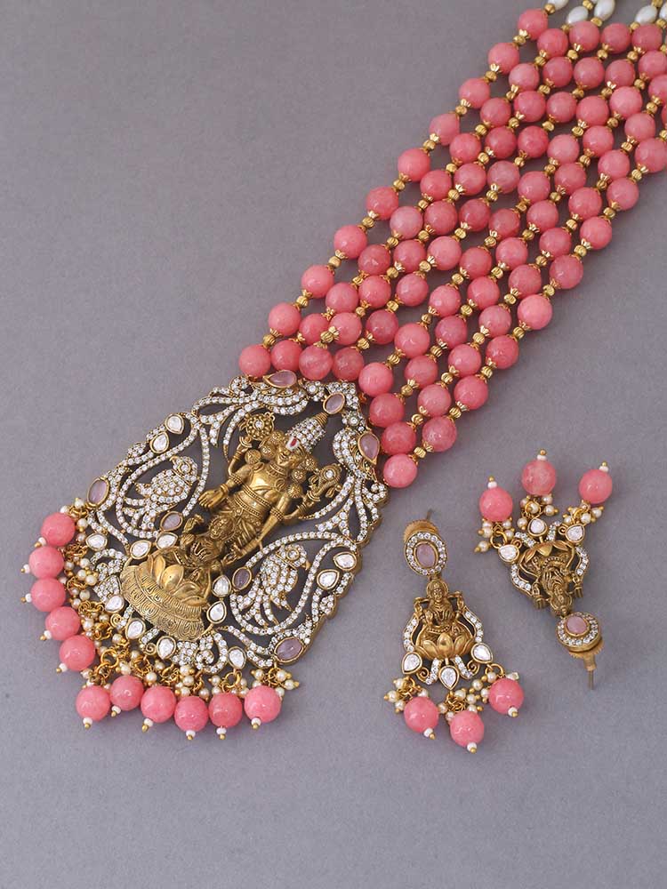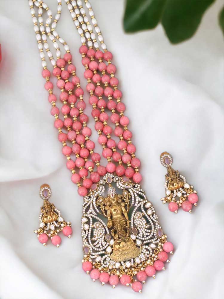 This necklace is the ultimate accessory option for the festive season. This set has a gorgeous circular floral pattern. The necklace has vibrant pearl detailing all over. The set also has a bright element of Kundan detailing in its structure. So, don't miss out on this gorgeous necklace set this eventful season as you have ramps to walk ahead.