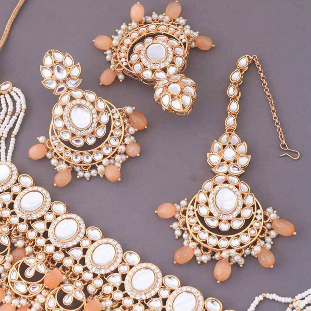 This necklace is the ultimate accessory option for the festive season. This set has a gorgeous circular floral pattern. The necklace has vibrant pearl detailing all over. The set also has a bright element of Kundan detailing in its structure. So, don't miss out on this gorgeous necklace set this eventful season as you have ramps to walk ahead.