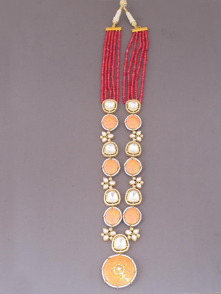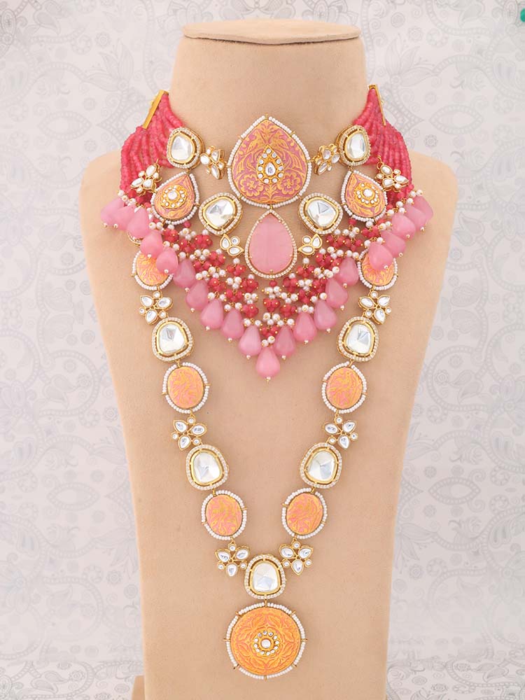 This necklace is the ultimate accessory option for the festive season. This set has a gorgeous circular floral pattern. The necklace has vibrant pearl detailing all over. The set also has a bright element of Kundan detailing in its structure. So, don't miss out on this gorgeous necklace set this eventful season as you have ramps to walk ahead.