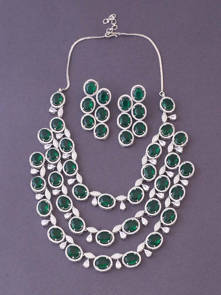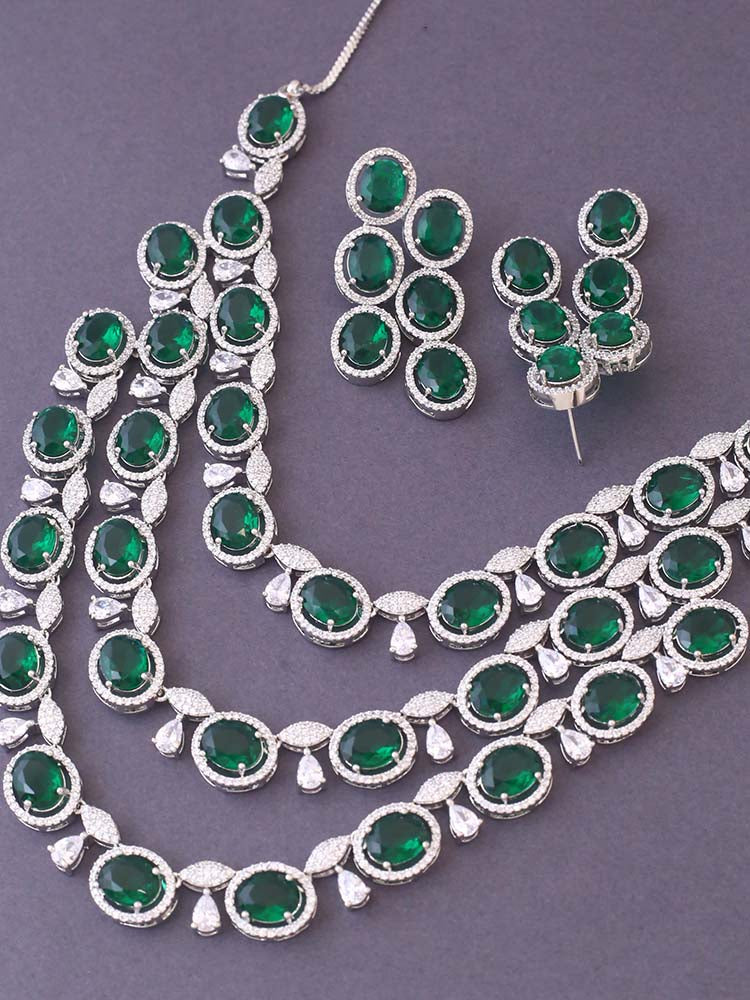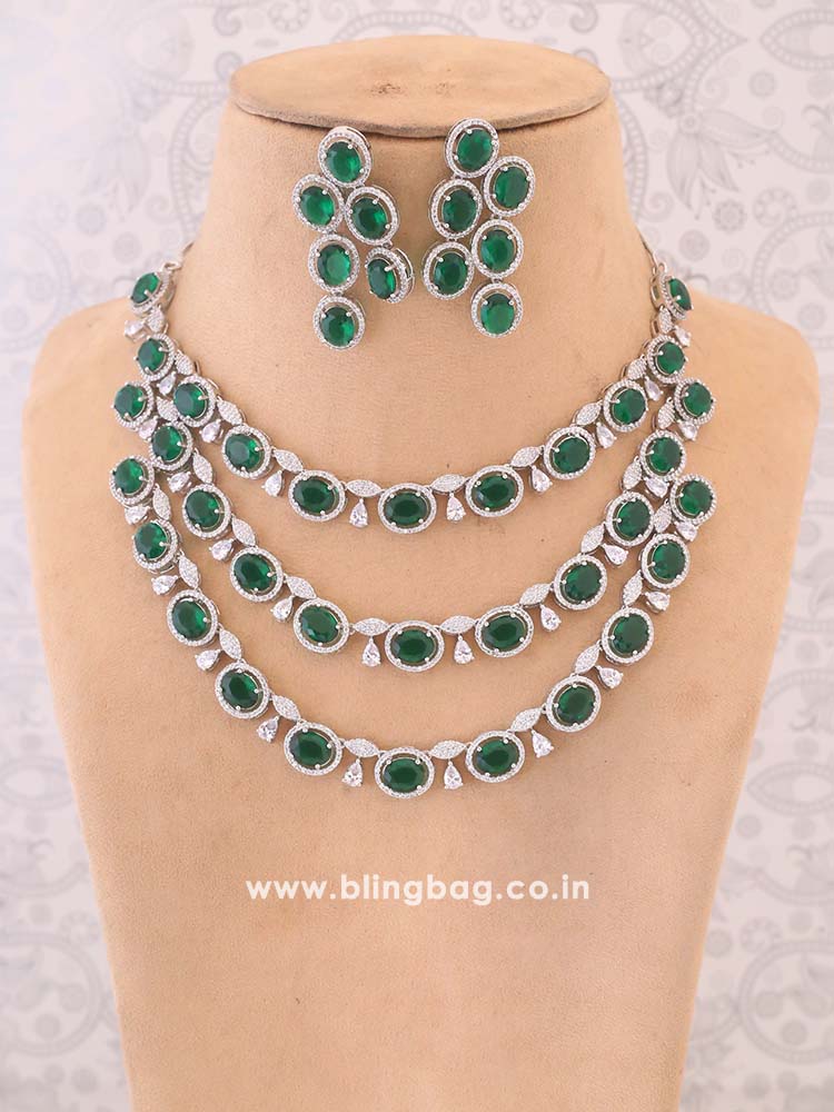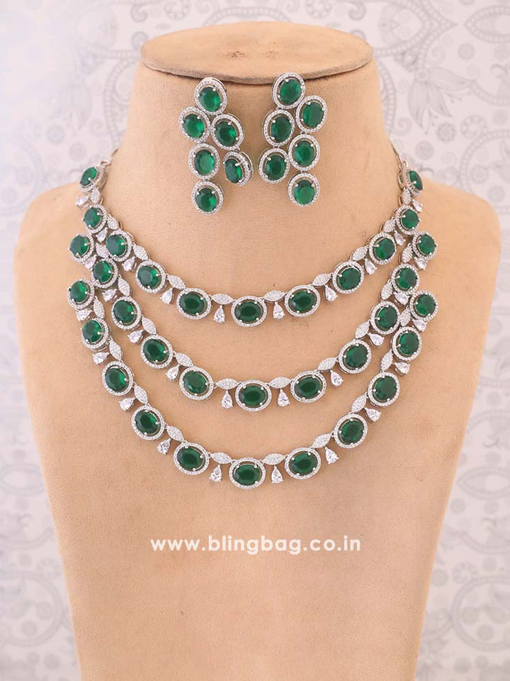 Pair your American diamond necklace set with a simple, solid-colored outfit to make the jewelry stand out and be the focal point of your look. Alternatively, layer the necklace with other delicate chains for a trendy, bohemian vibe.