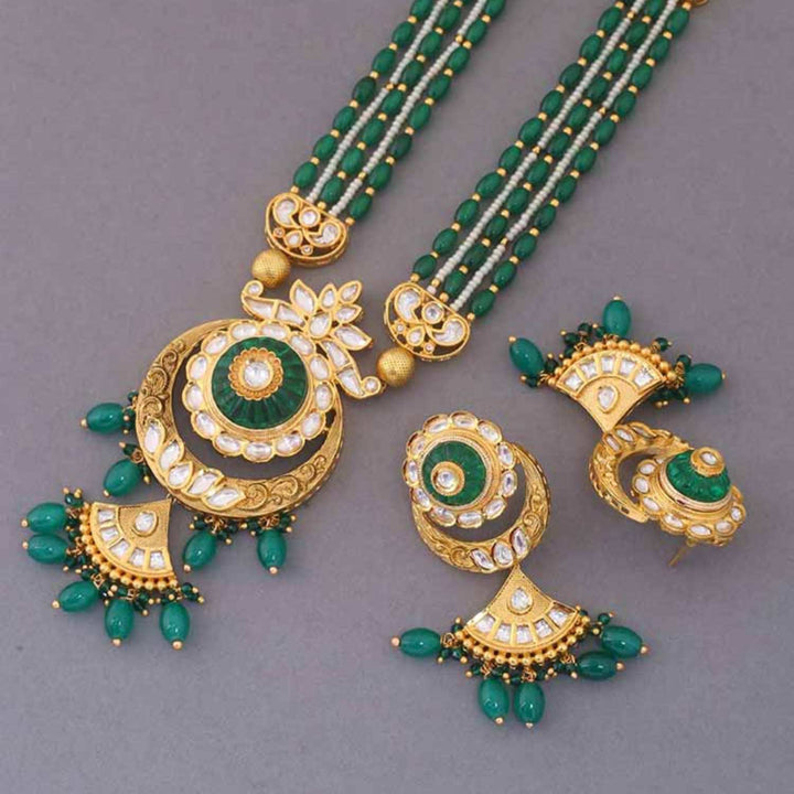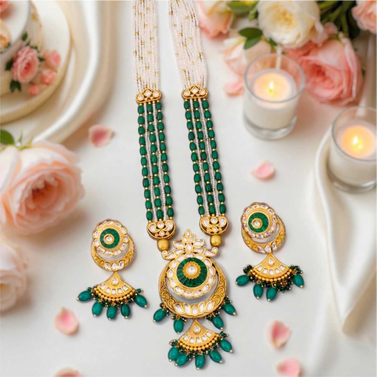This necklace is the ultimate accessory option for the festive season. This set has a gorgeous circular floral pattern. The necklace has vibrant pearl detailing all over. The set also has a bright element of Kundan detailing in its structure. So, don't miss out on this gorgeous necklace set this eventful season as you have ramps to walk ahead.
