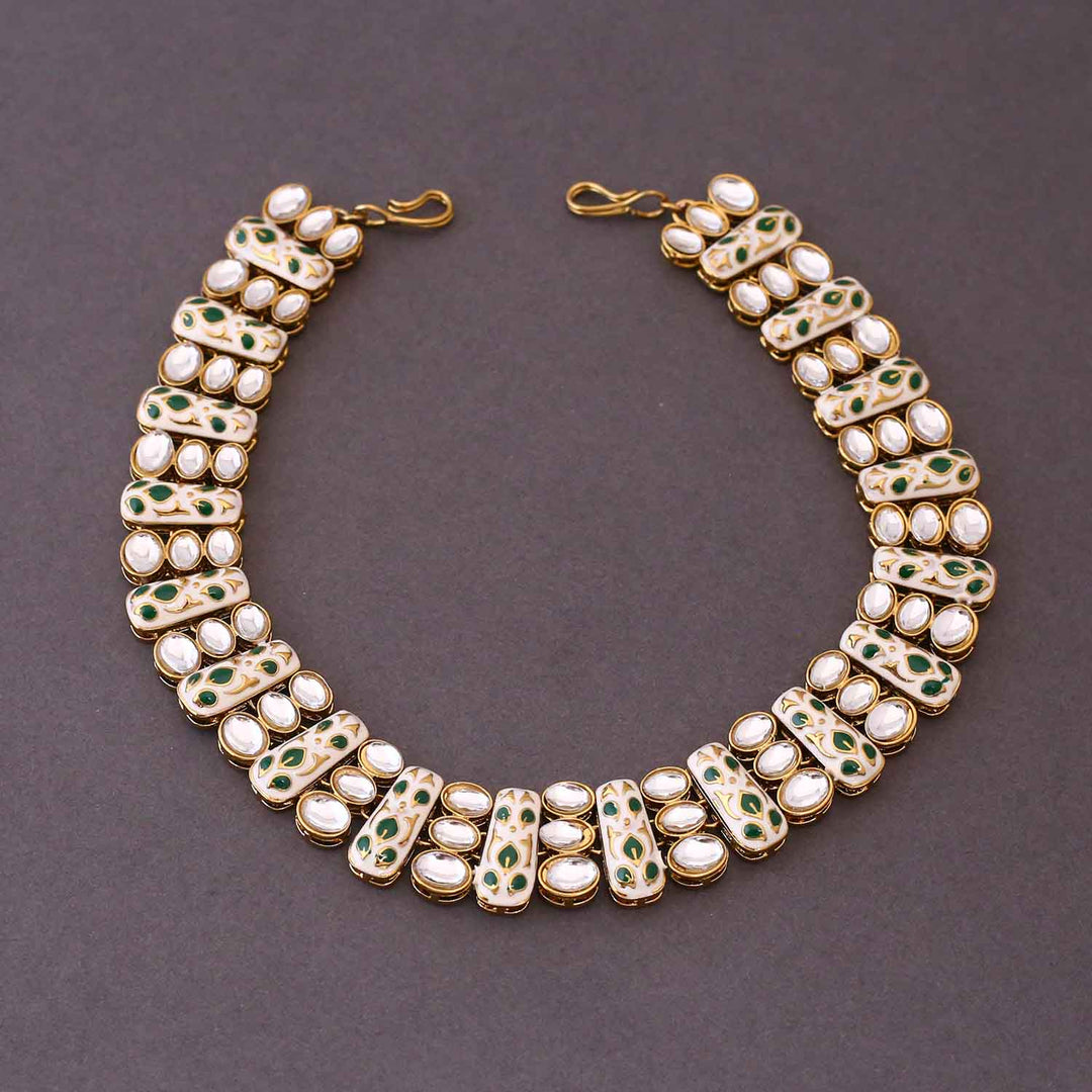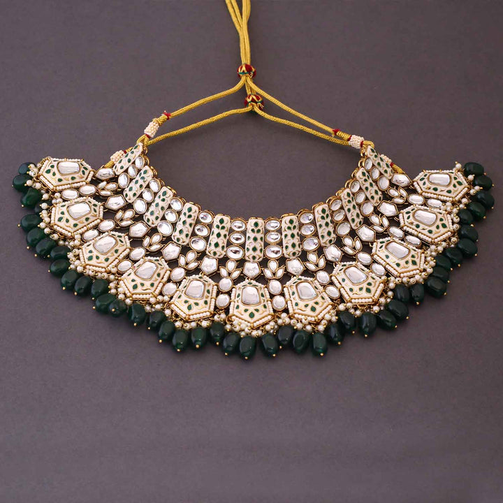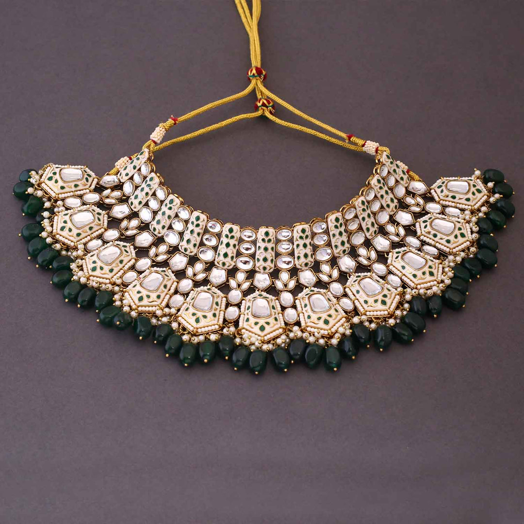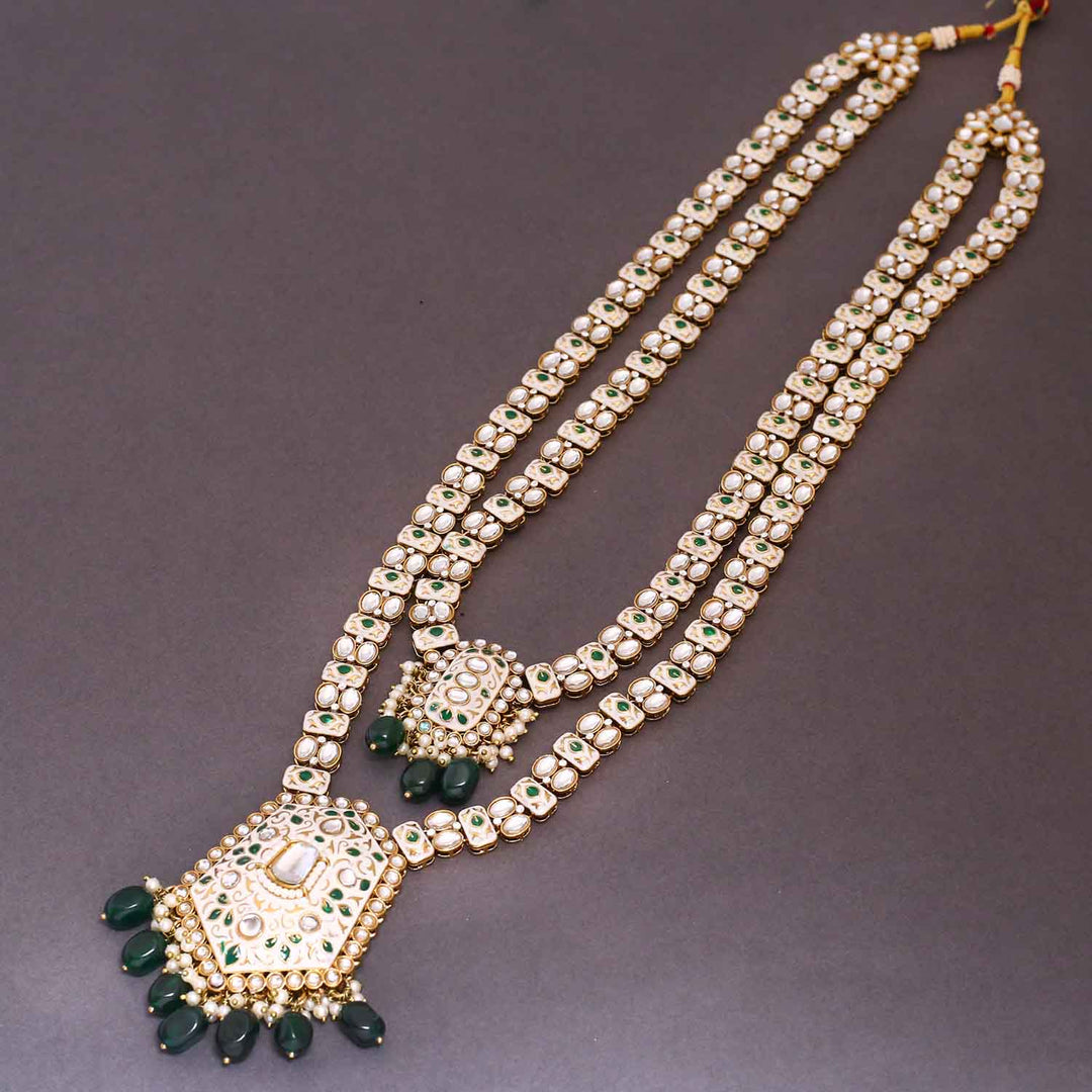 The set includes a stunning necklaces, matching earrings, and a beautiful maang tikka, all meticulously crafted with high-quality Kundan stones and lustrous pearls. The gold-plated finish adds a touch of elegance, making it a perfect complement to any bridal ensemble. With proper care, this jewelry will remain a cherished keepsake for years to come