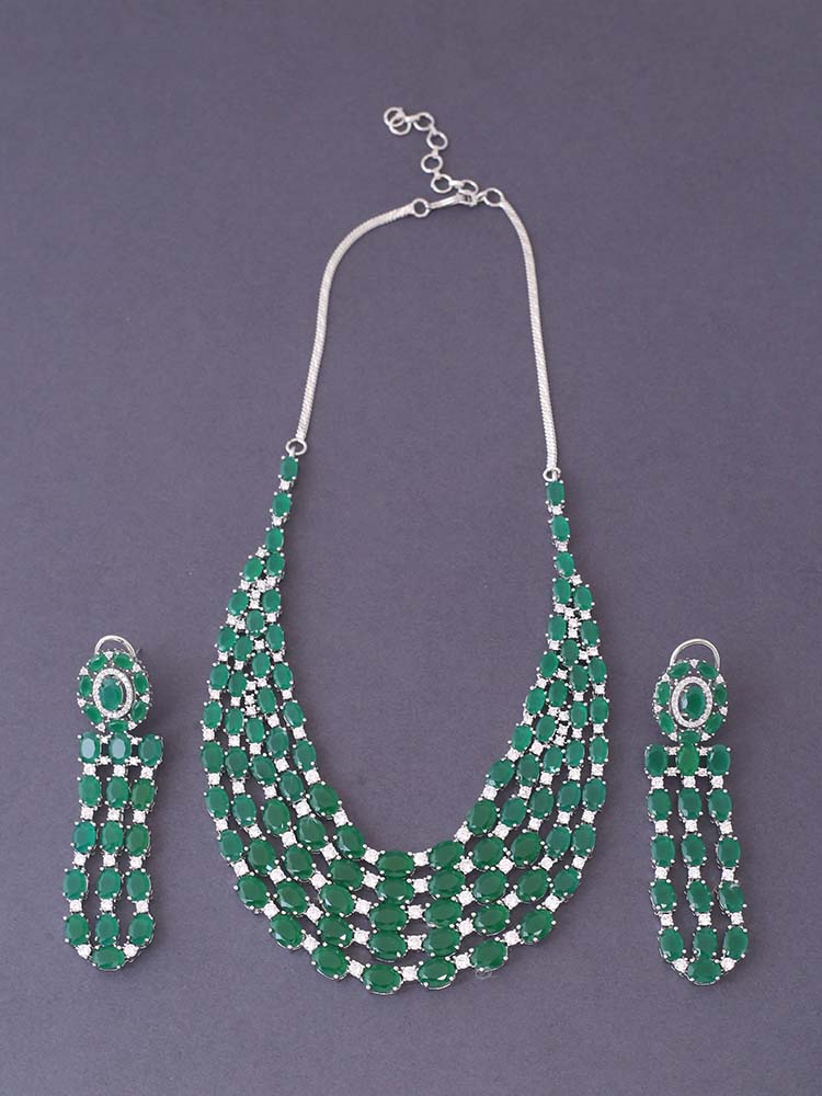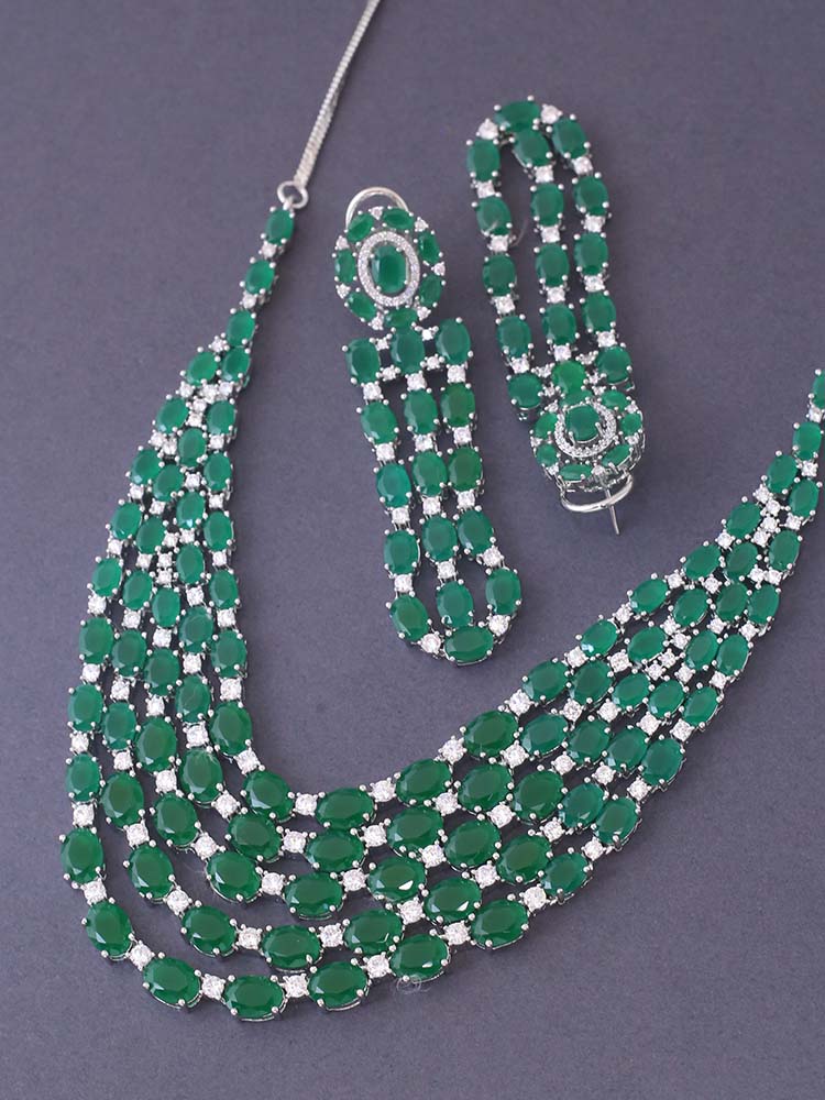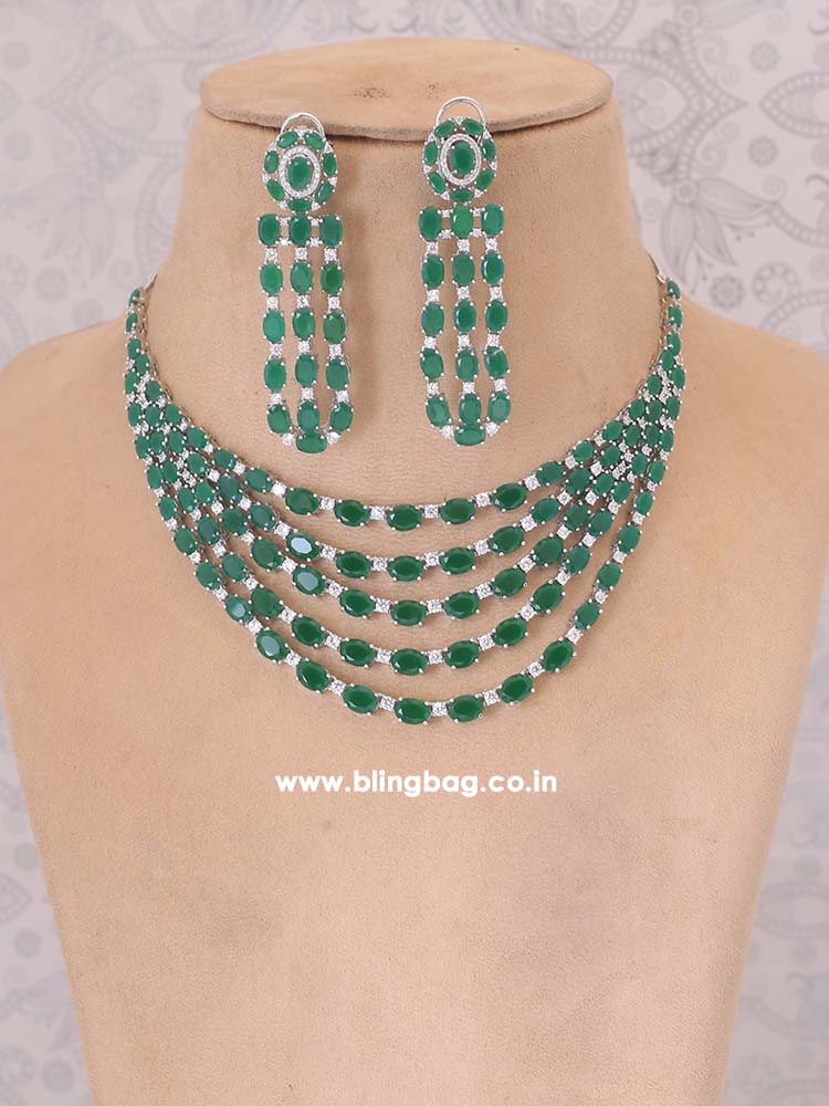 Pair your American diamond necklace set with a simple, solid-colored outfit to make the jewelry stand out and be the focal point of your look. Alternatively, layer the necklace with other delicate chains for a trendy, bohemian vibe.