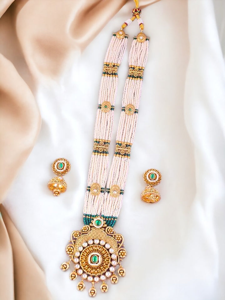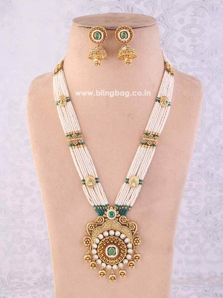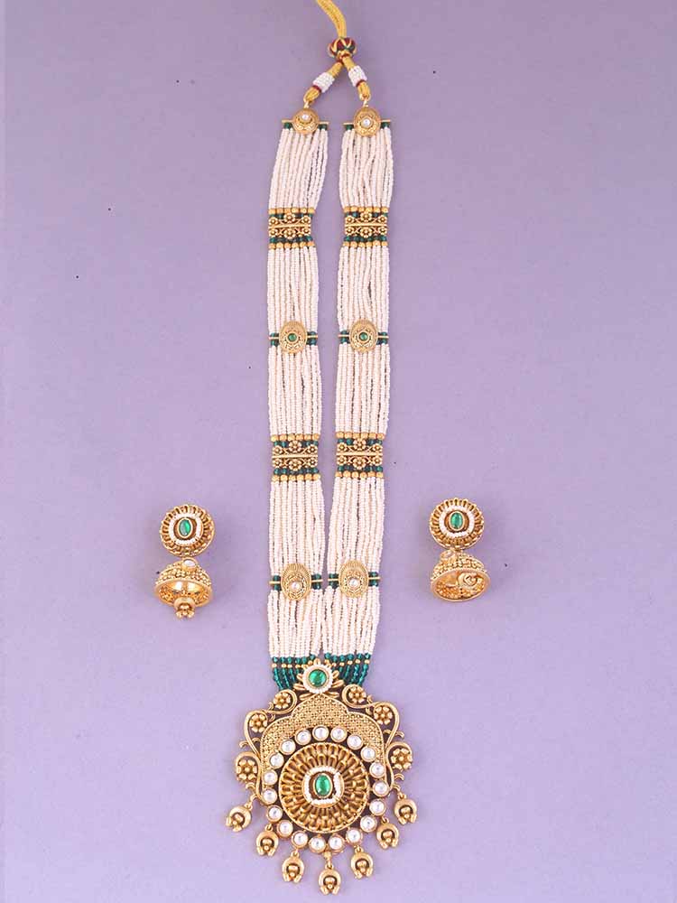 This necklace is the ultimate accessory option for the festive season. This set has a gorgeous circular floral pattern. The necklace has vibrant pearl detailing all over. The set also has a bright element of Kundan detailing in its structure. So, don't miss out on this gorgeous necklace set this eventful season as you have ramps to walk ahead.