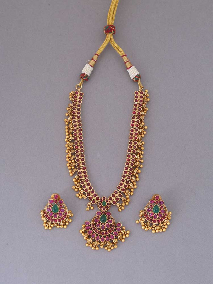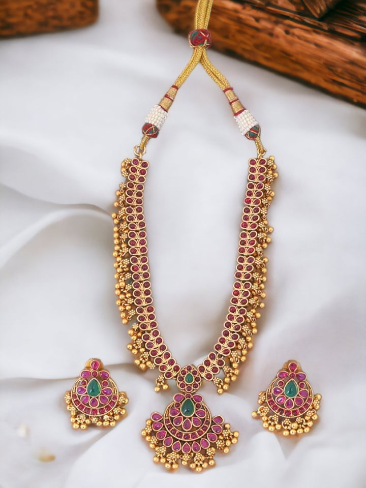 Pair this magnificent set with a rich silk saree in complementary tones to highlight the lush green emeralds. Sweep your hair into an elegant bun to allow the necklace and earrings to take center stage, completing a look that radiates timeless grace and sophistication.