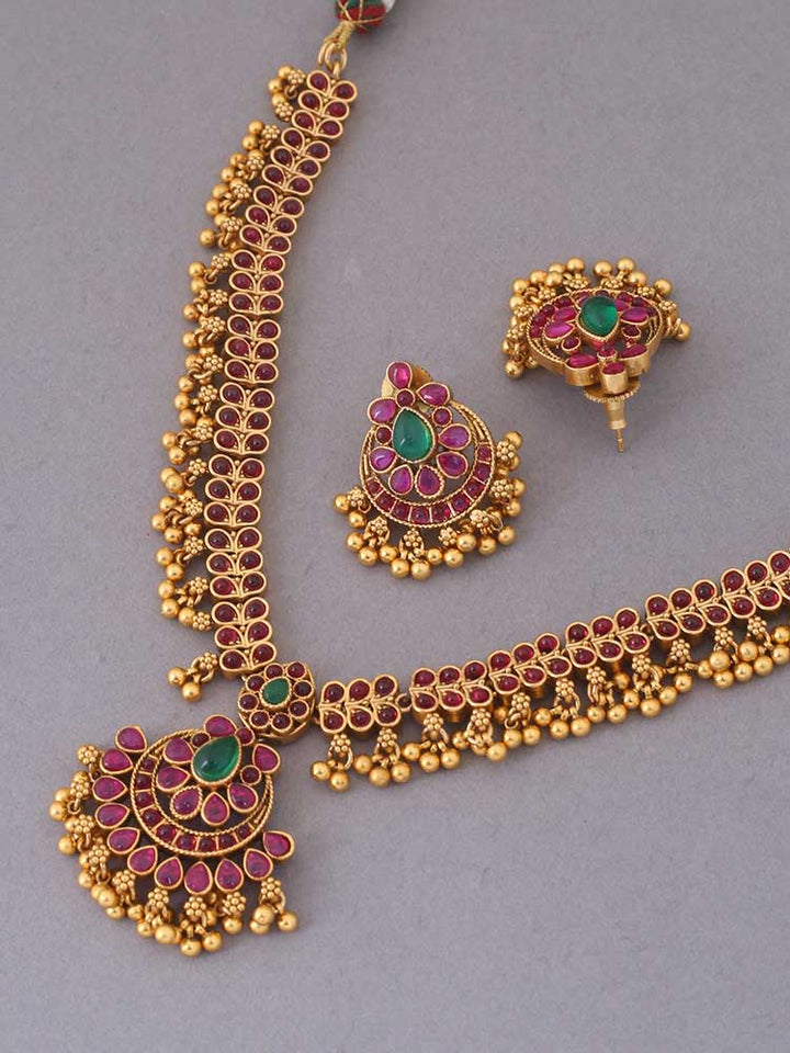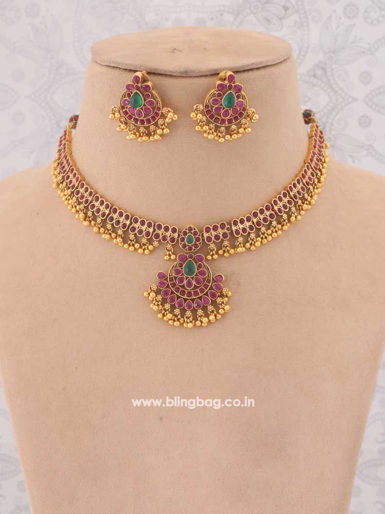 The Emerald Matangi Temple Jewellery Set embodies opulence and heritage with its exquisite craftsmanship. A resplendent display of emeralds and intricate temple motifs, this set exudes regal allure, perfect for grand occasions.