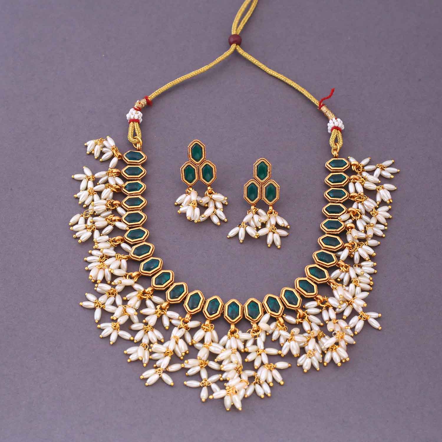 The temple necklace set epitomizes the grandeur and spiritual essence of Indian heritage, blending divine motifs with exquisite craftsmanship. Crafted with precision, each piece in the set showcases a harmonious blend of tradition and elegance.