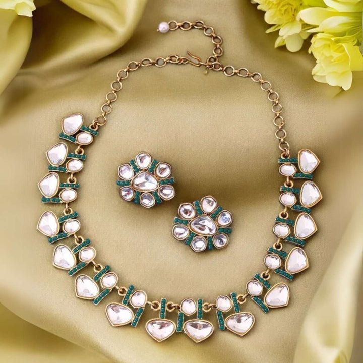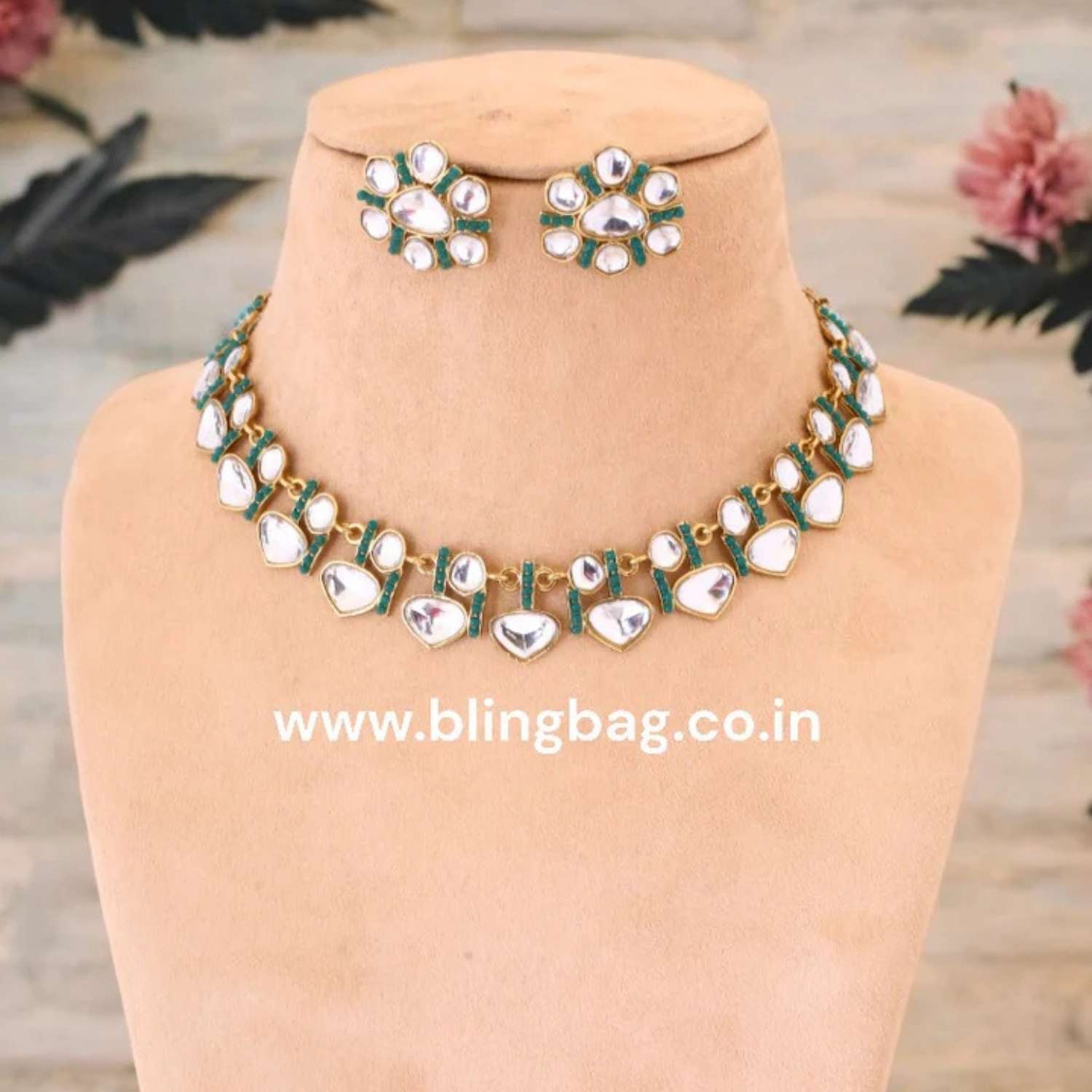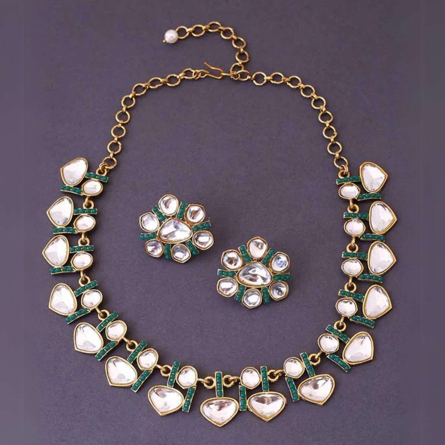The centerpiece of this set is a stunning necklace adorned with delicate floral motifs and ornate filigree work. Set in rich, antique gold or silver, the necklace showcases a dazzling central pendant, often embellished with sparkling gemstones such as garnets diamonds. The intricate chain design adds a touch of vintage allure, making it a striking accessory for both formal occasions and elegant evening wear.