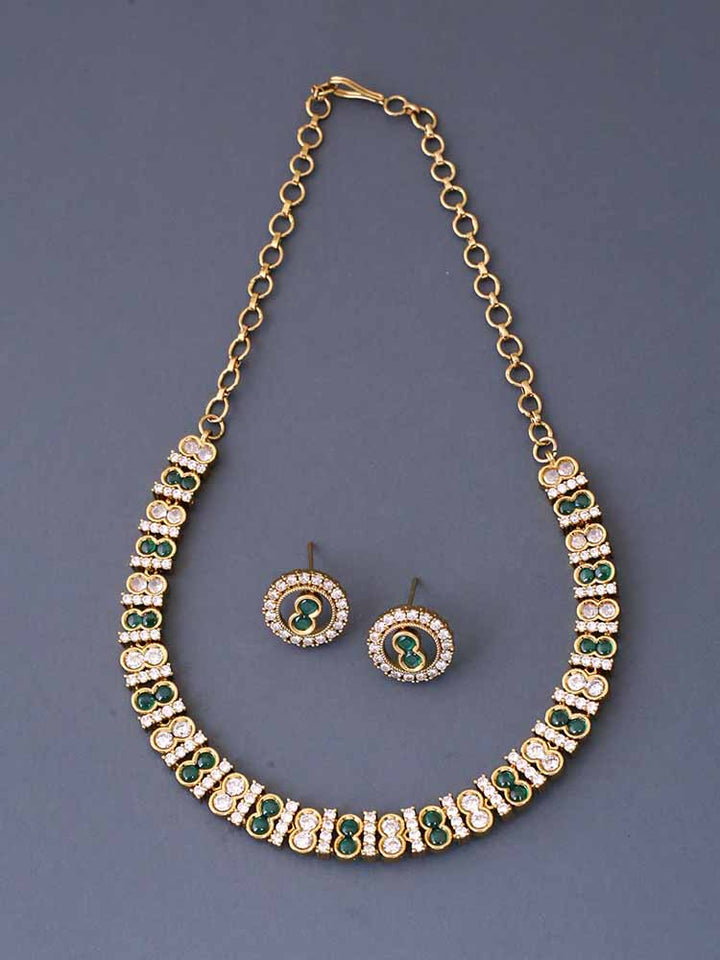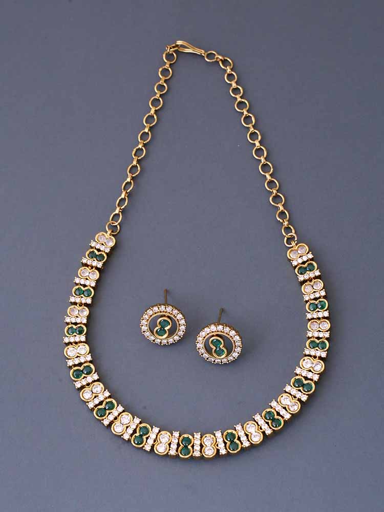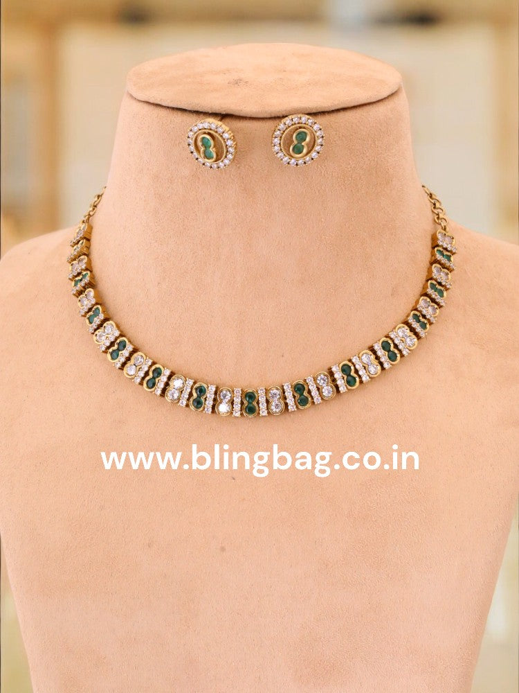 The centerpiece of this set is a stunning necklace adorned with delicate floral motifs and ornate filigree work. Set in rich, antique gold or silver, the necklace showcases a dazzling central pendant, often embellished with sparkling gemstones such as garnets, emeralds, or diamonds. The intricate chain design adds a touch of vintage allure, making it a striking accessory for both formal occasions and elegant evening wear.