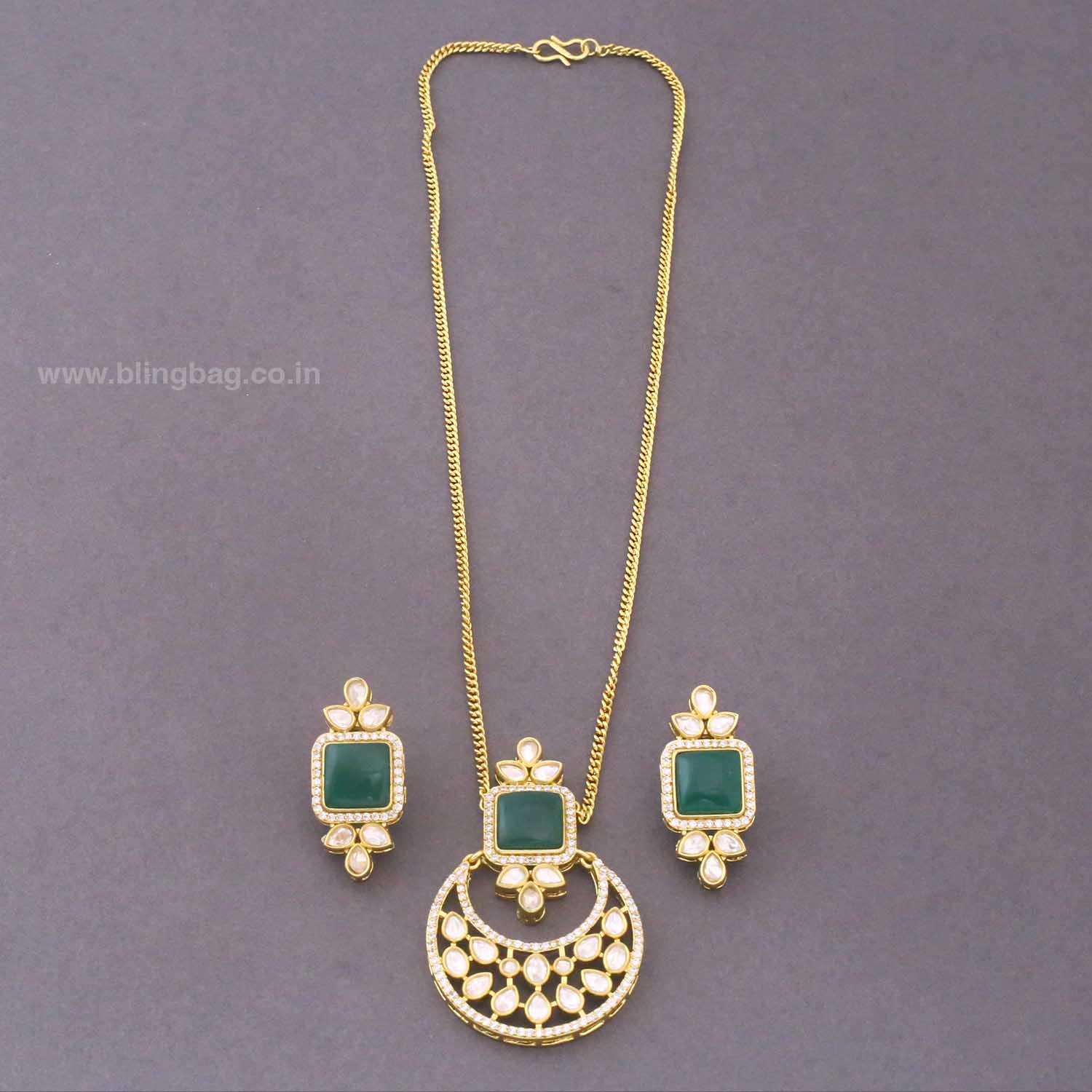 An elegant gold-toned pendant set featuring a refined chain with a square green centerpiece, beautifully framed by delicate white stones. The crescent-shaped drop design with intricate detailing adds a regal and festive charm. Paired with matching stud earrings, this set offers a perfect blend of modern grace and traditional artistry.
