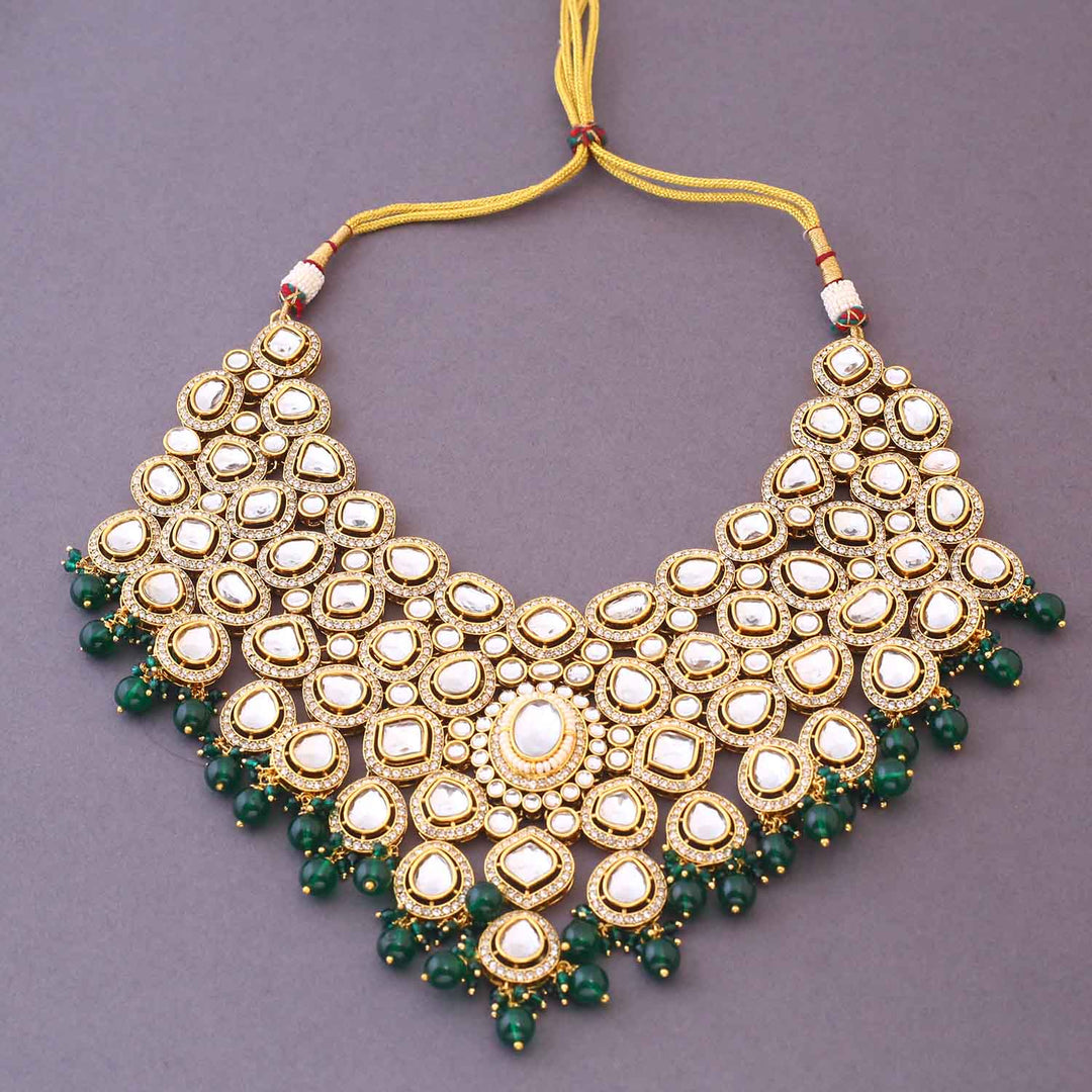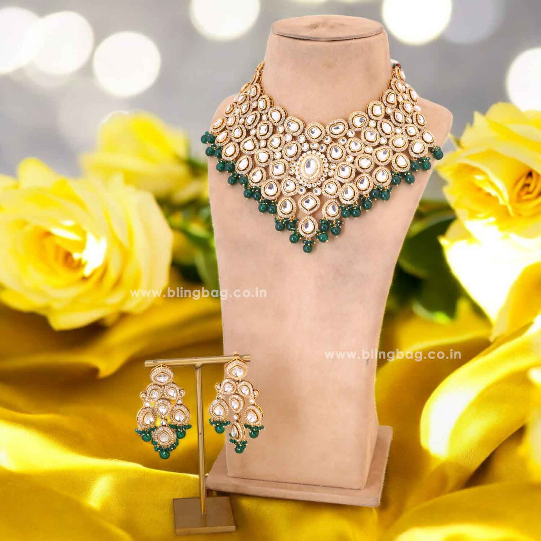 The set includes a stunning necklaces, matching earrings, and a beautiful maang tikka, all meticulously crafted with high-quality Kundan stones and lustrous pearls. The gold-plated finish adds a touch of elegance, making it a perfect complement to any bridal ensemble. With proper care, this jewelry will remain a cherished keepsake for years to come