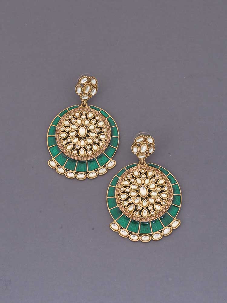 This is a gorgeous pair of earrings with an abundance of kundan motif all over. The pair gets even more beautification due to a dash of color in its work. The circular motif drop design gives the pair a very stylish look