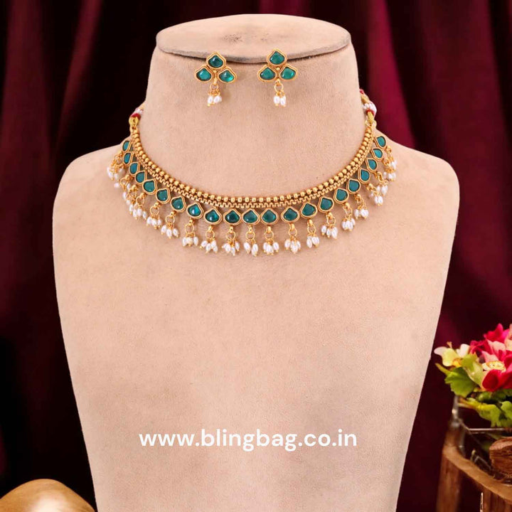 Discover glamour with the new Emerald Tejpreet Antique Jewellery Set. it's a timeless and elegant addition to any wardrobe. Elevate your style with this luxurious and exclusive set.