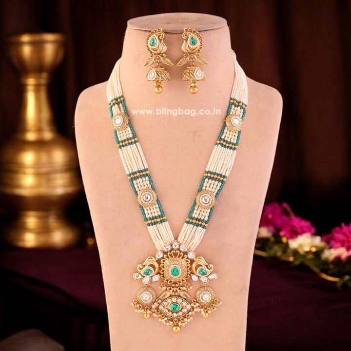 This necklace is the ultimate accessory option for the festive season. This set has a gorgeous circular floral pattern. The necklace has vibrant pearl detailing all over. The set also has a bright element of Kundan detailing in its structure. So, don't miss out on this gorgeous necklace set this eventful season as you have ramps to walk ahead.