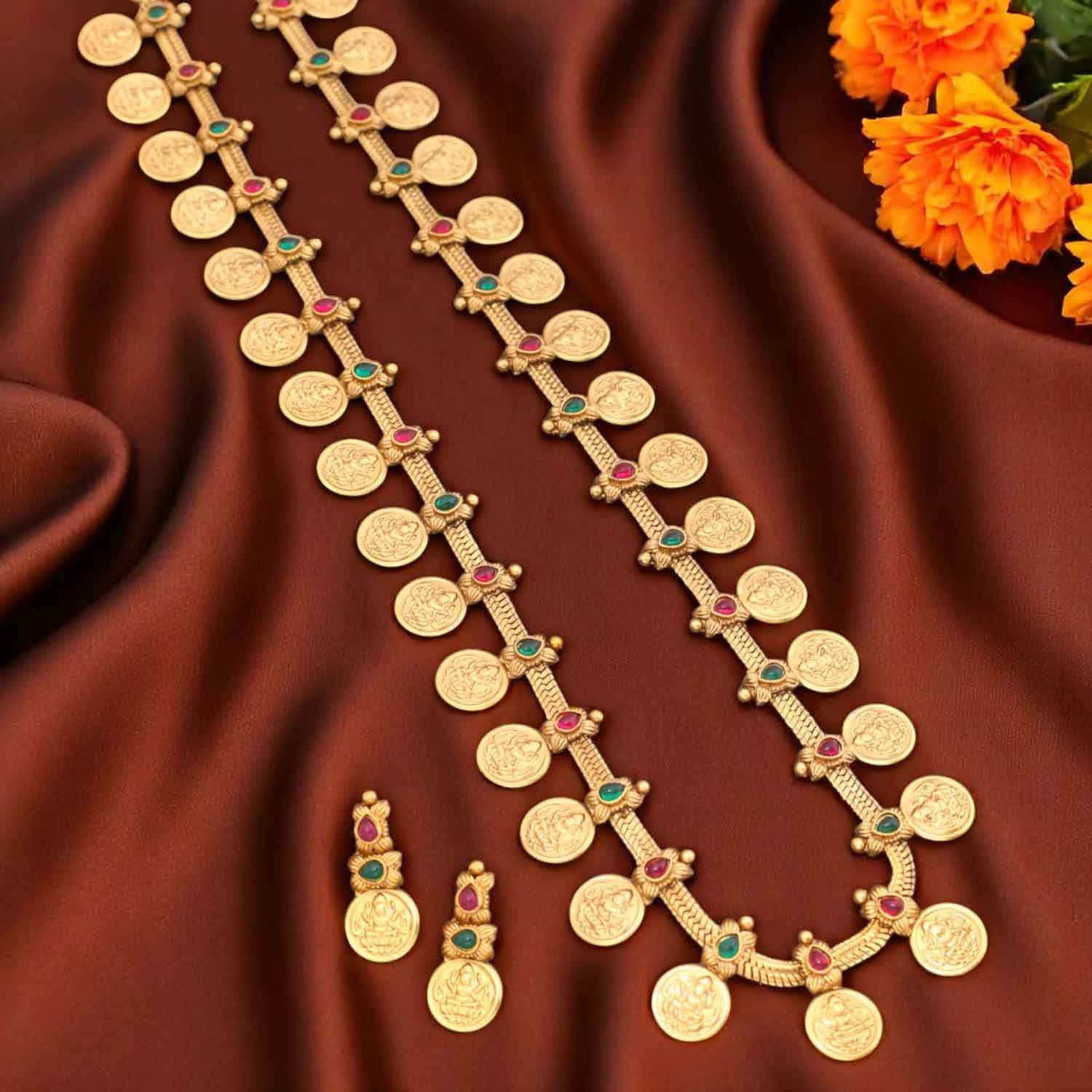 The temple necklace set epitomizes the grandeur and spiritual essence of Indian heritage, blending divine motifs with exquisite craftsmanship. Crafted with precision, each piece in the set showcases a harmonious blend of tradition and elegance.