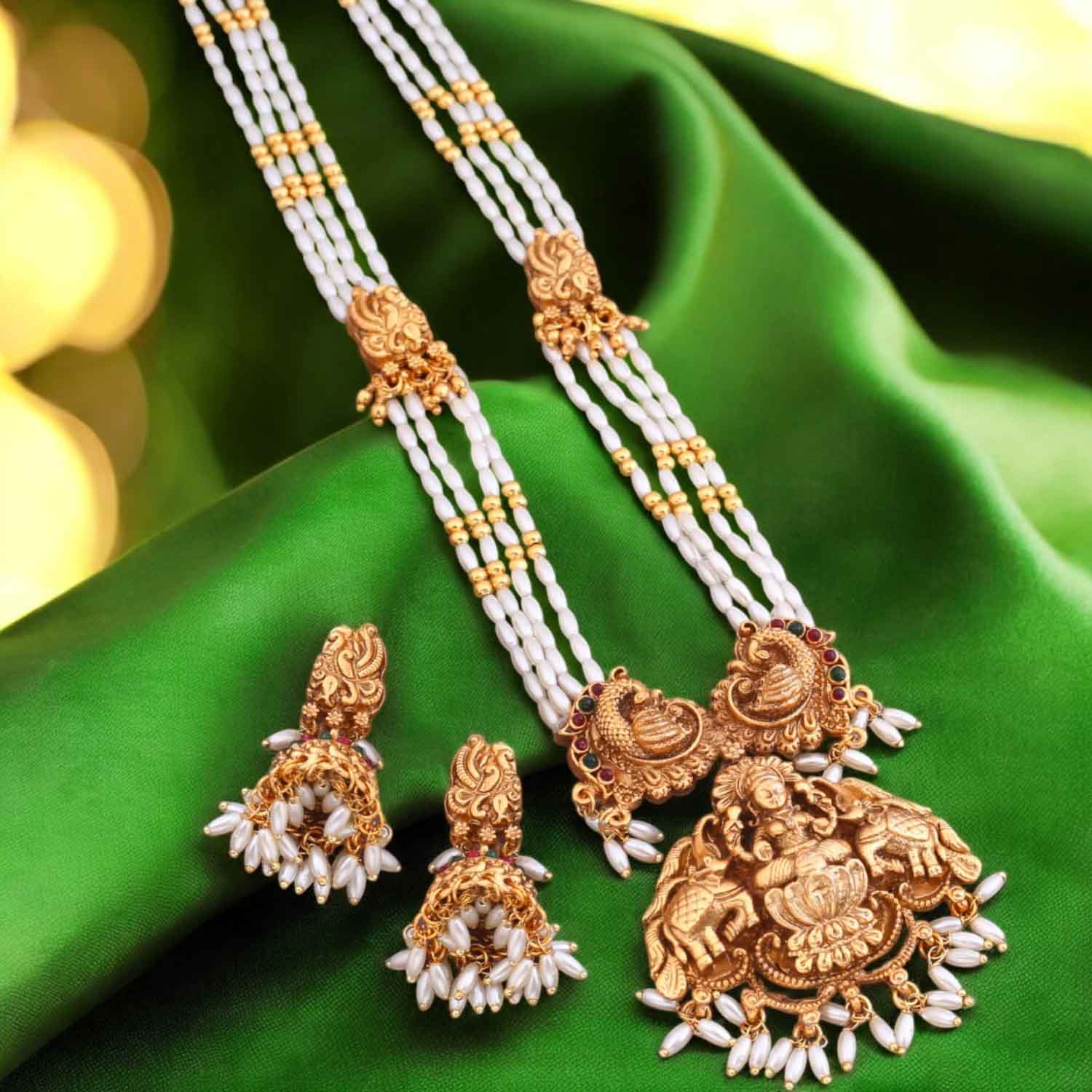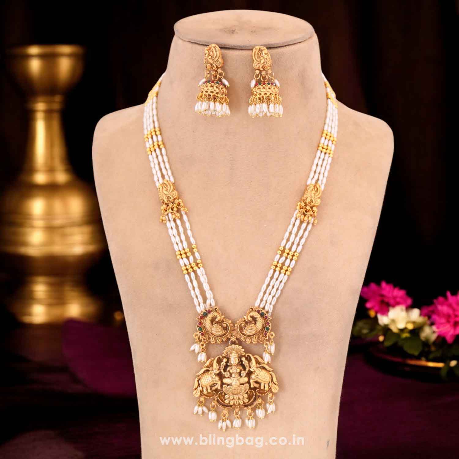 The temple necklace set epitomizes the grandeur and spiritual essence of Indian heritage, blending divine motifs with exquisite craftsmanship. Crafted with precision, each piece in the set showcases a harmonious blend of tradition and elegance.