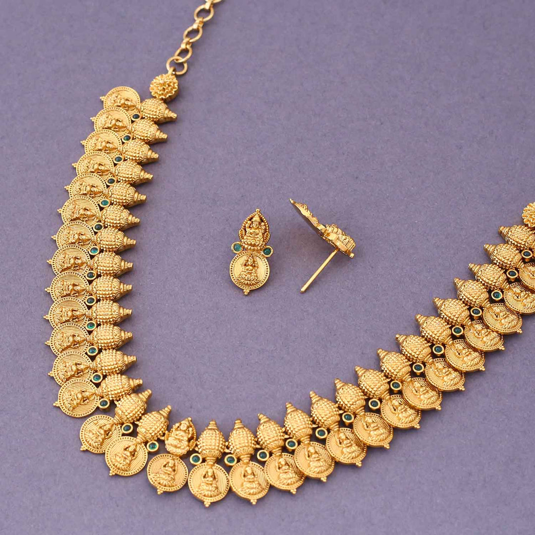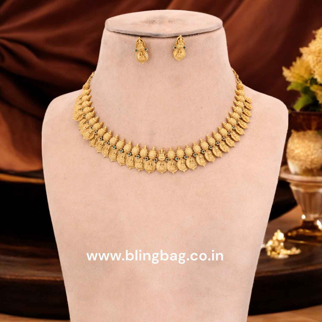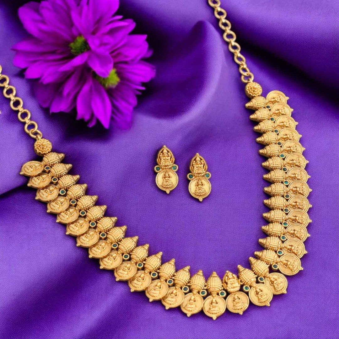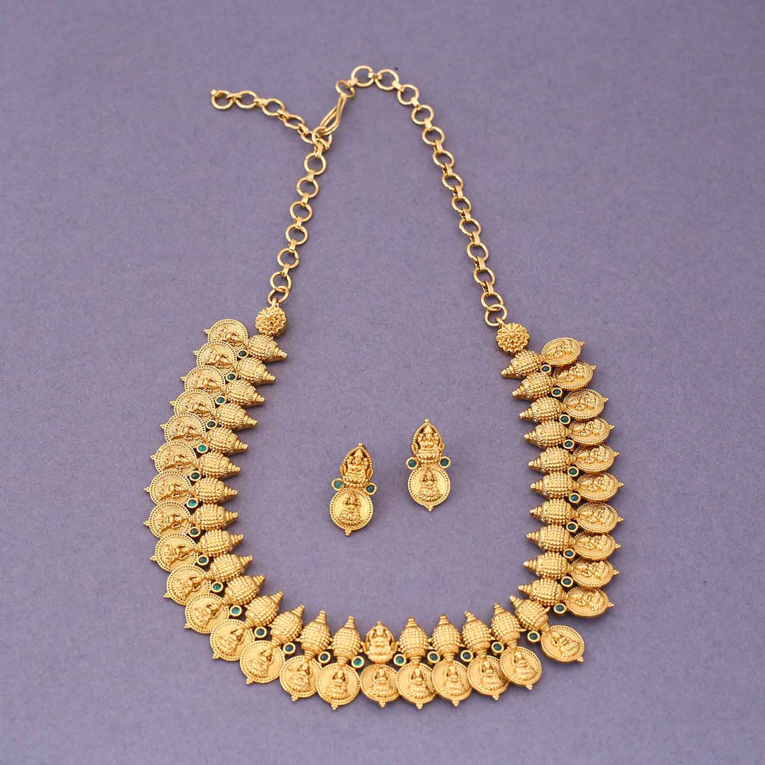 The temple necklace set epitomizes the grandeur and spiritual essence of Indian heritage, blending divine motifs with exquisite craftsmanship. Crafted with precision, each piece in the set showcases a harmonious blend of tradition and elegance.