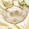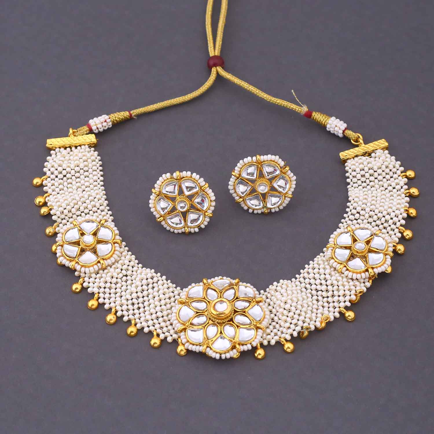 This necklace is the ultimate accessory option for the festive season. This set has a gorgeous circular floral pattern. The necklace has vibrant pearl detailing all over. The set also has a bright element of Kundan detailing in its structure. So, don't miss out on this gorgeous necklace set this eventful season as you have ramps to walk ahead.