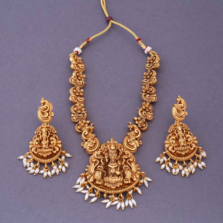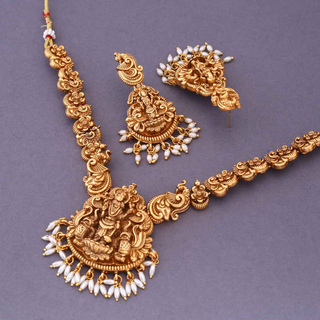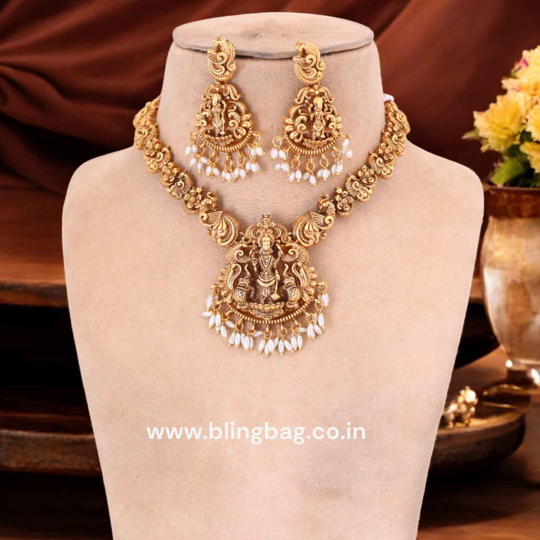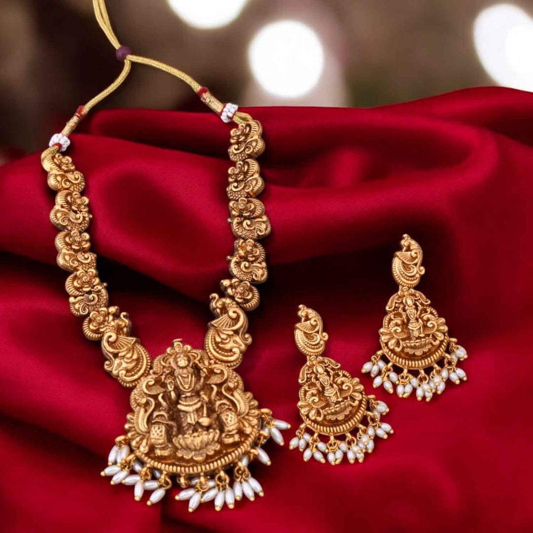 The temple necklace set epitomizes the grandeur and spiritual essence of Indian heritage, blending divine motifs with exquisite craftsmanship. Crafted with precision, each piece in the set showcases a harmonious blend of tradition and elegance.